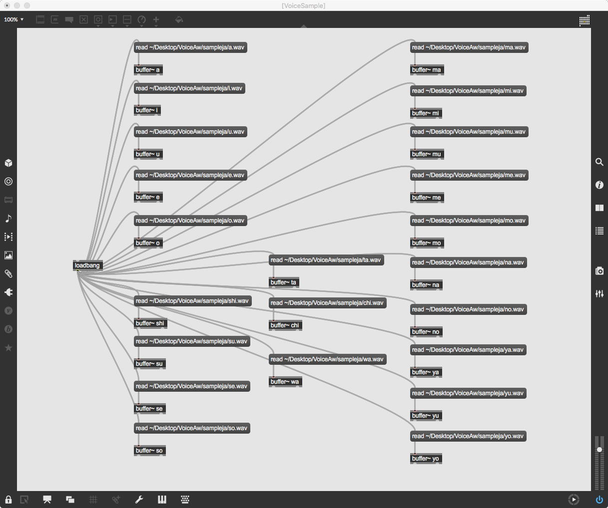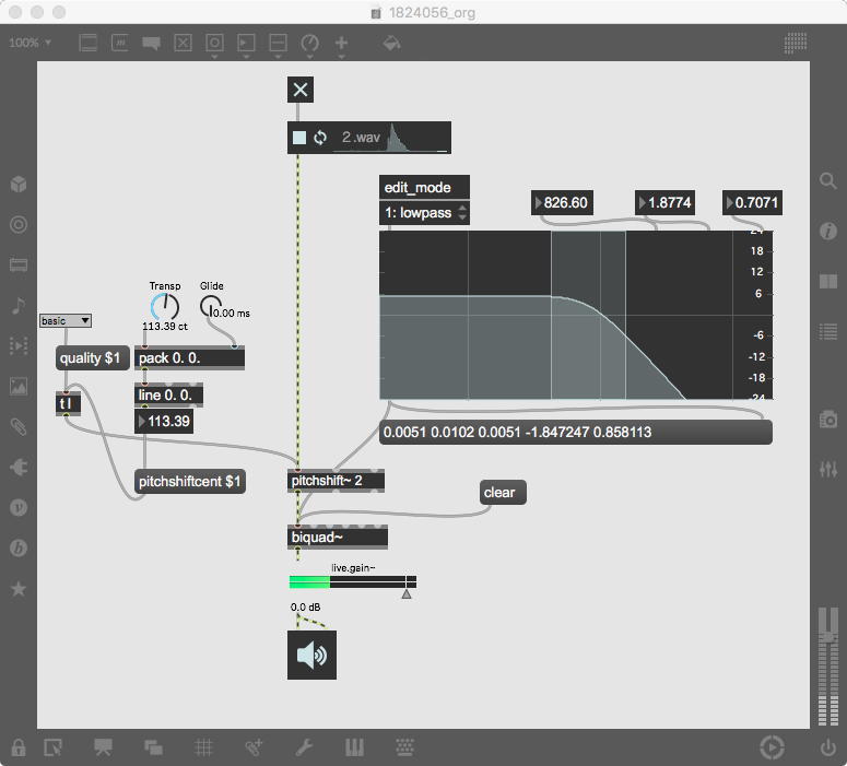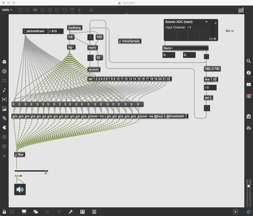 上のパッチは清水さんの「ヤニーかローレルか」を確認するパッチで、サンプルを再生して「pitchshift~」であれこれ変えれば、まぁ「ヤニー」か「ローレル」に聞こえる??・・・というそのもので、ちょっと僕としてはあまり意外性が感じられなかった。 やっぱりMaxの「pitchshift~」は、ちょっと反則だよなぁ。(^_^;)