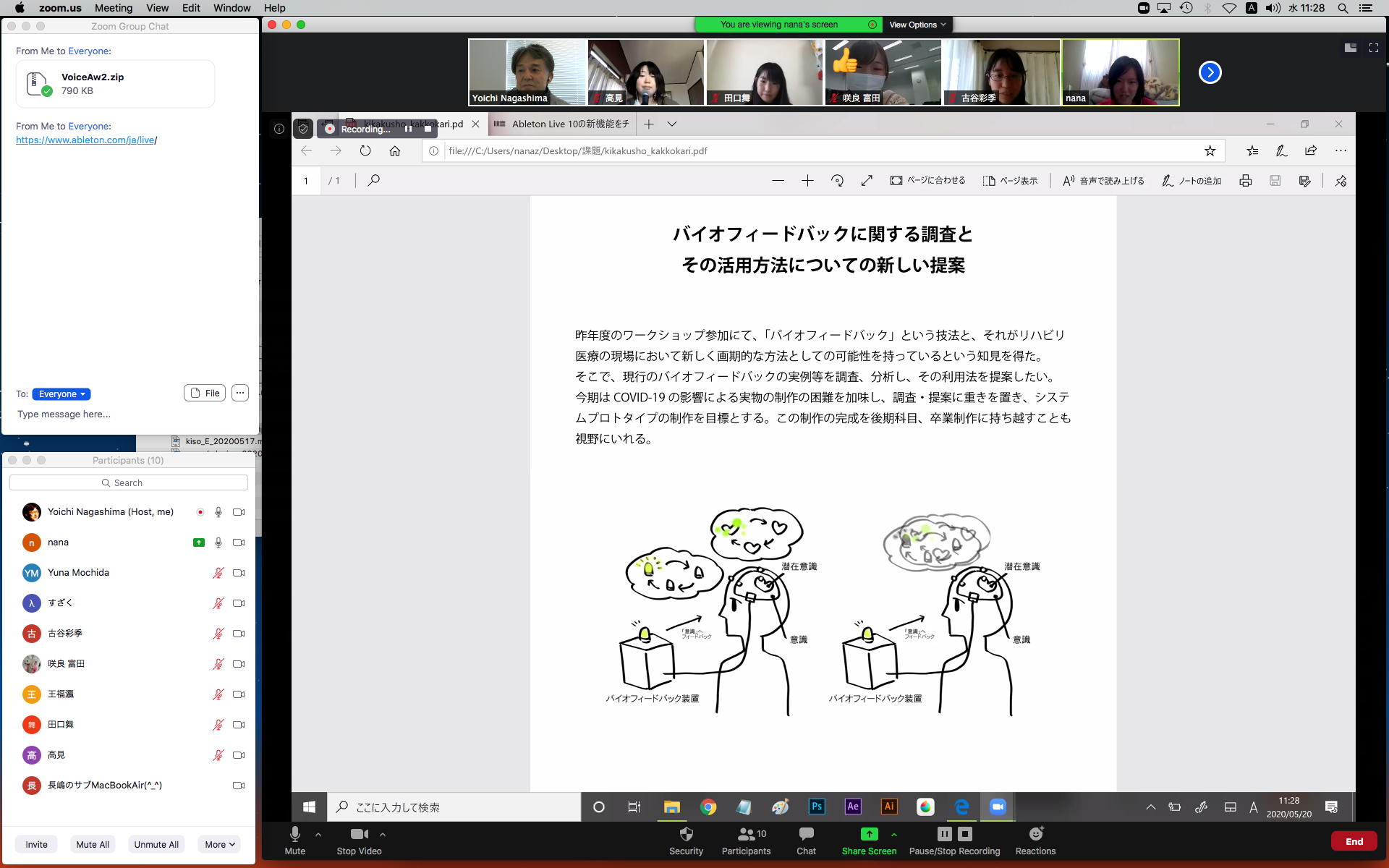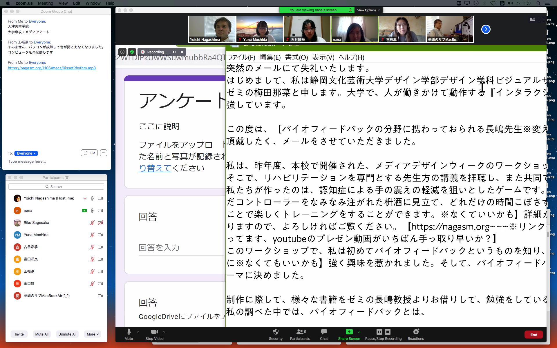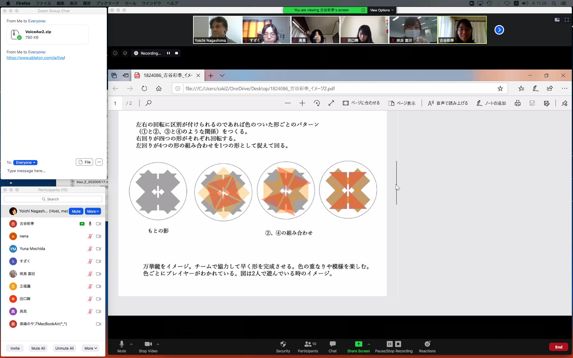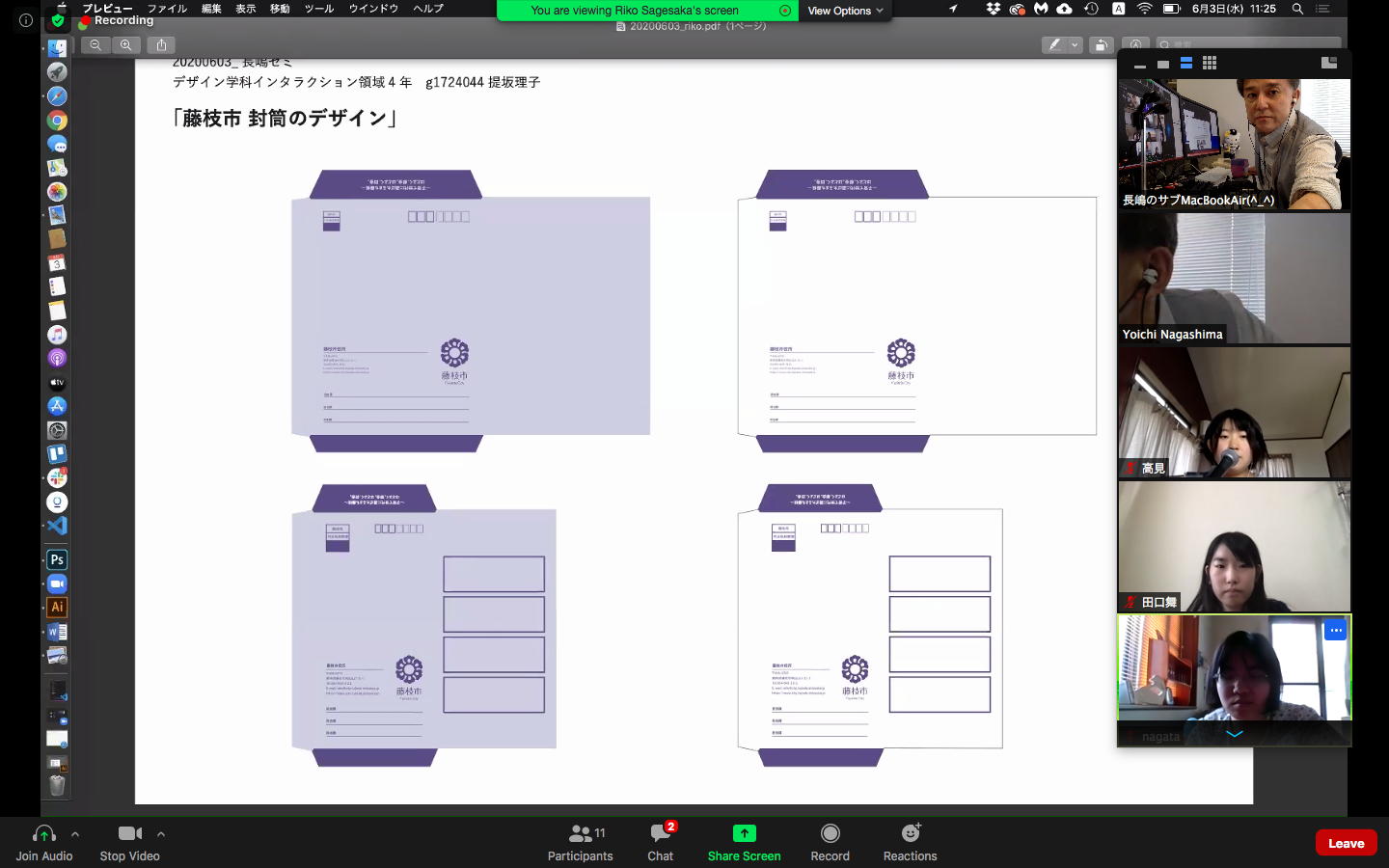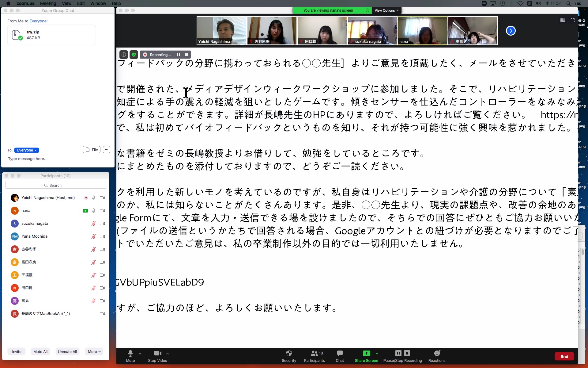 そしてここからゼミZOOM会議となり、欠席の理子ちゃんもメイルで経過報告PDFを送ってくれて、以下のように全員で有意義な情報交換ゼミを進めた。 皆んなそれぞれ、遠隔環境ながら、ちゃんとプロジェクトを進めているのはさすがだ(^_^)。 ちなみに(リンク切れするが)全60分の記録動画は これ である。