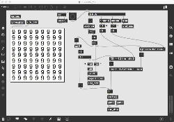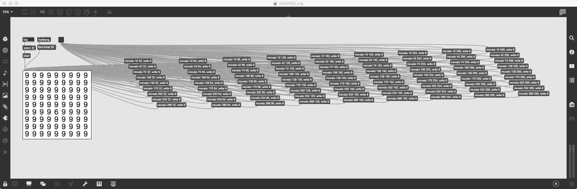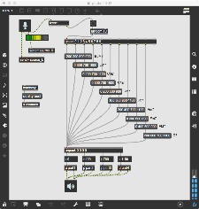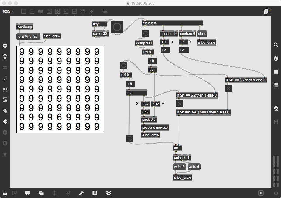 上のパッチは池田クンの「9の中に6が一つ紛れているもの」であり、上が元の馬鹿正直に作られたパッチで、これでも正しく動いてやりたい事は実現できているが、数字を表示する座標はX軸もY軸も等間隔なので、明らかに「数学的に整然と並べる」ことが出来る筈である。 下が改訂したバージョン「1824005_rev.maxpat」であり、サブパッチも何ない、たったこれだけであるものの、元パッチと比較してその美しさは全く違う。 「uzi」とは特殊なオブジェクトで、例えば「uzi 9」とあると、入力のbangに対して、「可能な最高速でbangを9回、出す」。 ただしこの「可能な最高速で」というのがポイントで、「bangを出す」と、そのパッチで「そのbang出力によって影響される全てのことが起きた」後で、すかさず次のbangが出るということで、ここにdelayが入らないのが「最高速」という意味である。 実際の使い方としては左端出力のbangでなく、右端出力の「index」(整数)を使うが、ここはゼロ起点でなく「1から始まる」ことが注意点である。 つまり「uzi 9」は、左端入力のbangがあると、まず最初に右端出力にスタートの「1」を出してからbangを出して、パッチ内でこの出力に関連する全てが行き渡った後で、delayナシに次に右端出力に「2」を出してからbangを出して・・・というように続けて、最後の「9」まで出してストップする。