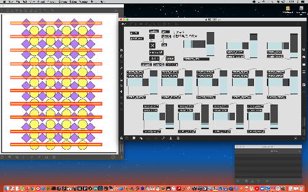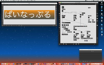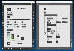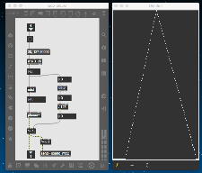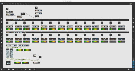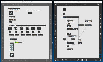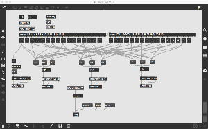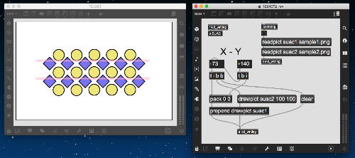 上のパッチも昨日の夕方にやっていたもので、「たるんだリボン」を元にした古谷さんのパッチを改良したものである。 Draw系で数学的に描画するのでなく、移動させる元図形をイラレで作っていたが、透過していていい感じである。 元パッチもきちんと動いていたが、ここはサブパッチでスッキリさせるとともに、それぞれのパーツが移動できるとともに、同類のパーツが一斉に同じように動くことも実装した。
