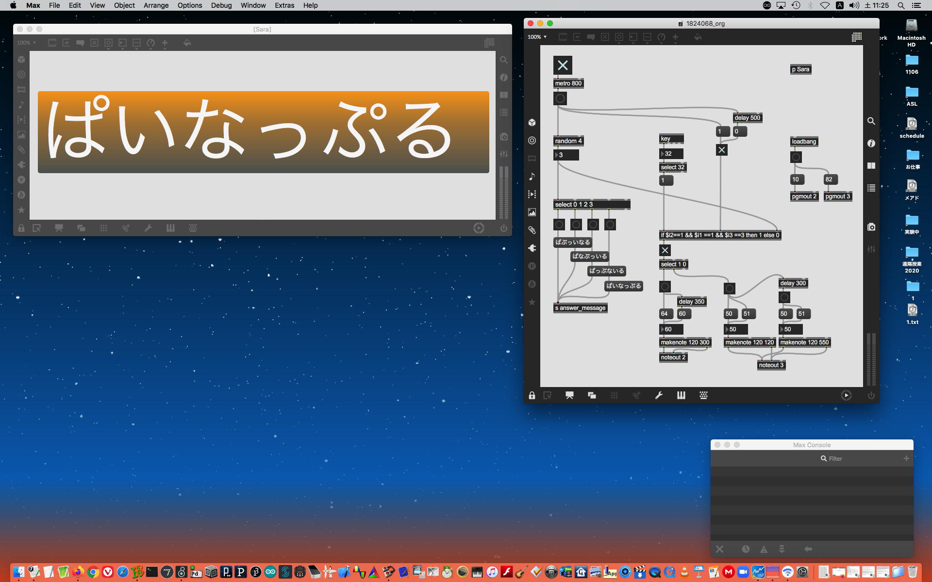 上のパッチは富田さんの、間の文字が入れ替わり、正しい言葉を当てる「タイポグリセミア」のゲームを元に、一気に簡易的なゲームとして作ってしまった「1824068_rev.maxpat」である。「metro 800」(0.8秒間隔)でランダムに表示を切り替えて、そこから500msec以内にスペースキーを叩くようにした。タイミング勝負の部分など、あちこち参考になると思うので、教材としてはまずまずだろう。