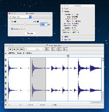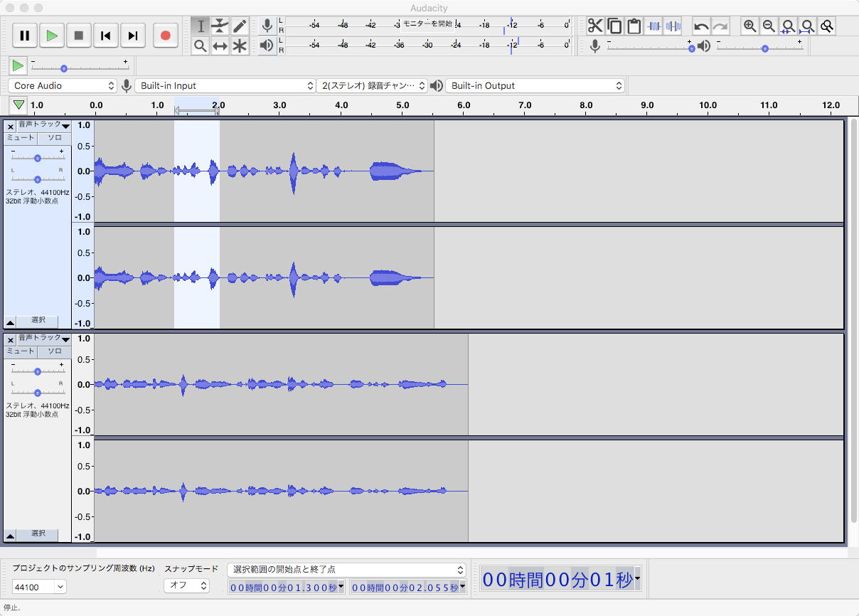そして、再びそれぞれのサウンドエディタを起動しては実験してみて、結局、 Audacity が「後で有料」というoptionもなく、さらにPreferencesで日本語から無事に英語に戻せたことで、ほぼやりたい事が出来る、と判明した。 調べてみるとけっこうフリーのサウンドエディタとして有名らしく(Windows/Mac/Linuxのマルチプラットフォームというのもポイント)、YAHOO JAPANに日本語のマニュアル的サイトもたくさんあったので、これを使うことにした。 カーソル位置で波形をサッと分割できればいいのだが、それが出来ない(Command+Bでマークを付けて、マークの前後をファイルでマルチに書き出す)という仕様には、慣れていくしかないことになる。