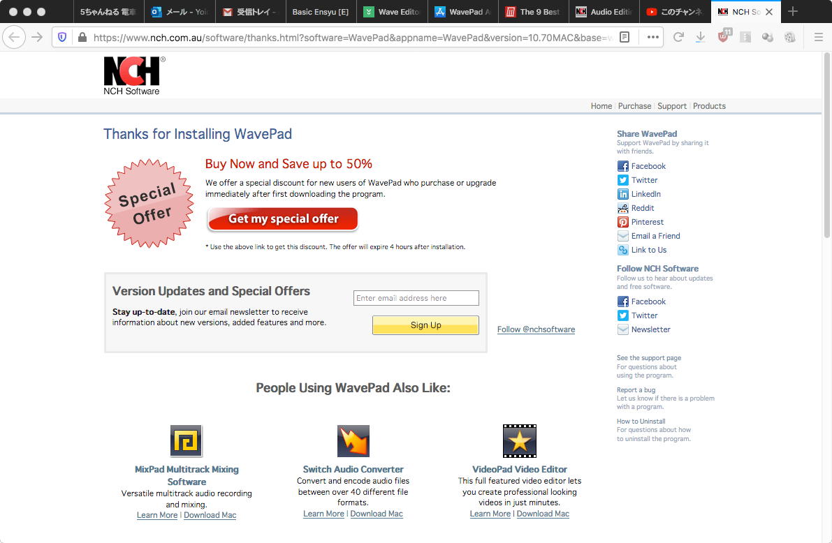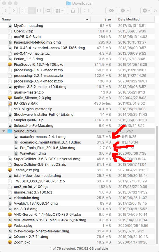 The 9 Best Free and Cheap Audio Editors for Mac からゲットするためにチェックしたサウンドエディタはここまで5種(1つは「買ってね」攻撃のためパス)、ただし上のようにあまりにProToolsのサイズが突出しているので、当面これを解凍/インストールするのは待って放置して、次に進むことにした。 しかし6番目はなんと GarageBand だった(^_^;)。 これはお仕事Mac miniにもちょっと古いバージョンが入っているが、機能的に今回は使えない(サウンドファイルの保存の際に余計な部分が加わる)と知っているので、これまたパスである。 するとその後の7番目のReaper は$60、8番目の Adobe Audition は「Subscription from $20.99/month」、9番目の Fission は$35、と全て有料なのでこれまたパス、ということで、ここまでで「サイズが小さくてFree」という候補は Audacity と WavePad Audio Editing Software for Mac と OcenAudio の3つということになった。 あと2つの候補だったのは、 WavePad Audio Editor と Wave Editor for Mac である。