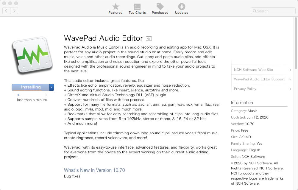 このうちApp Storeで上のようにFree版をダウンロードした(アップグレードは99.99ドル) WavePad Audio Editor は、実はすでにインストールしていた WavePad Audio Editing Software for Mac と同じものだった。 ただしサイズが前者は12.9MB、後者は7.9MBとちょっと謎である。