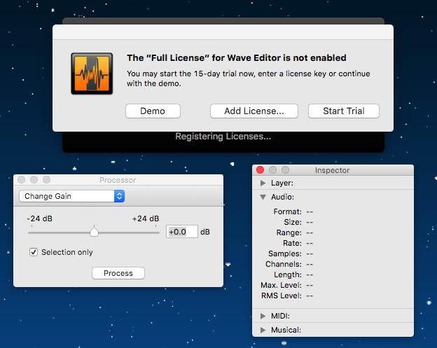 そして最後の Wave Editor for Mac をダウンロードしてみると、サイズはそこそこだったが、「15日間のトライアルはFree」というのが出てきた。 その後は有料になるとしても、このサイズのままだとするとどうなっているのだろう(^_^;)。