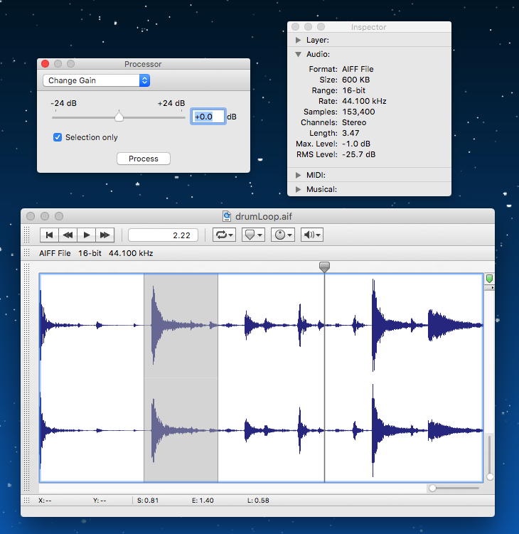上は WavePad Audio Editing Software for Mac というエディタであり、最初に日本語にするか英語にするか(もちろん英語)を聞いてきたのは良かったが、いったん終了するともうさっそく「半額にするので購入してね」が出てきて閉口した。 これも使うとしても後回し候補である。