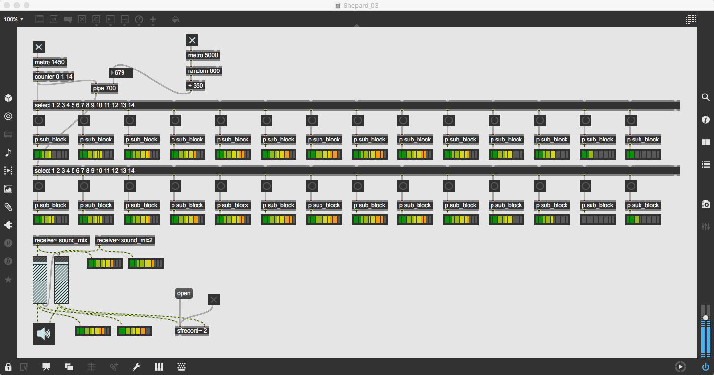 今日はとりあえず サウンドデザイン の教材を一発撮りしてYouTubeに上げたいのだが、北京の王さんから「ネットで、risset rhythmのオーディオを解析しましたが、リズムサンプリングを使うだけでは、「無限に速くなっていくビート」の錯覚現象は実現できないかもしれません。「シェパードトーン」も必要があると思いますので、「drum machine」パッチで、「シェパードトーン」の部分を加えました。しかし、risset rhythmの効果もありません。リズムをどう処理すれば無限に加速の錯覚がありますか。どうしたら良いかわからなくて、すごく迷っています。」との切実なメイルが届いていたので、作戦を変更した。