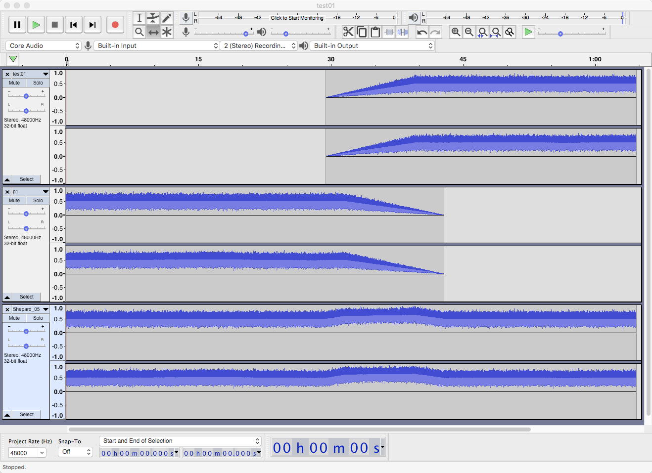 これらのエディタのどれを使おうか・・・というテストのために、ここでMax8を立ち上げて、上のようなShepard Toneを生成するパッチをササッと作ってみた。 「徐々にピッチが上がっていく」という漸増特性はリニアでは駄目で指数関数を使うのだが、ここで利用したのが「mtof」オブジェクトの入力は整数だけでなく浮動小数点数がOKだ、という「フォルマント兄弟」の知見である。 つまりMIDIノートナンバの世界であればここは単純に「line」オブジェクトでリニアに増加させていけばいいわけで、指数変換は「セント(MIDI)→周波数(ピッチ)」という「mtof」が勝手に綺麗に数値を補間してくれるのだ。 「cycle~」ではちょっと響きが淋しいので「phase~」を使い、さらに左チャンネルは単純に漸増していくのに対して、右チャンネルではパーシャルのスタート時間を5秒ごとにわずかにズラしているので、長時間にわたって「完全に同一でない」Shepard Toneという、以下のような15MBほどのサウンドファイルが出来た。 これを素材として、「ループサウンド」に編集する(フェイドインとフェイドアウトをかけて、真ん中に切れ目を入れてから移動させて、クロスフェードして、両端がこの切れ目になるような波形を書き出す)というサウンドエディタが欲しいのである。