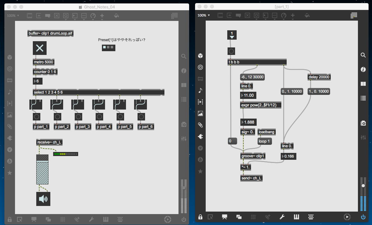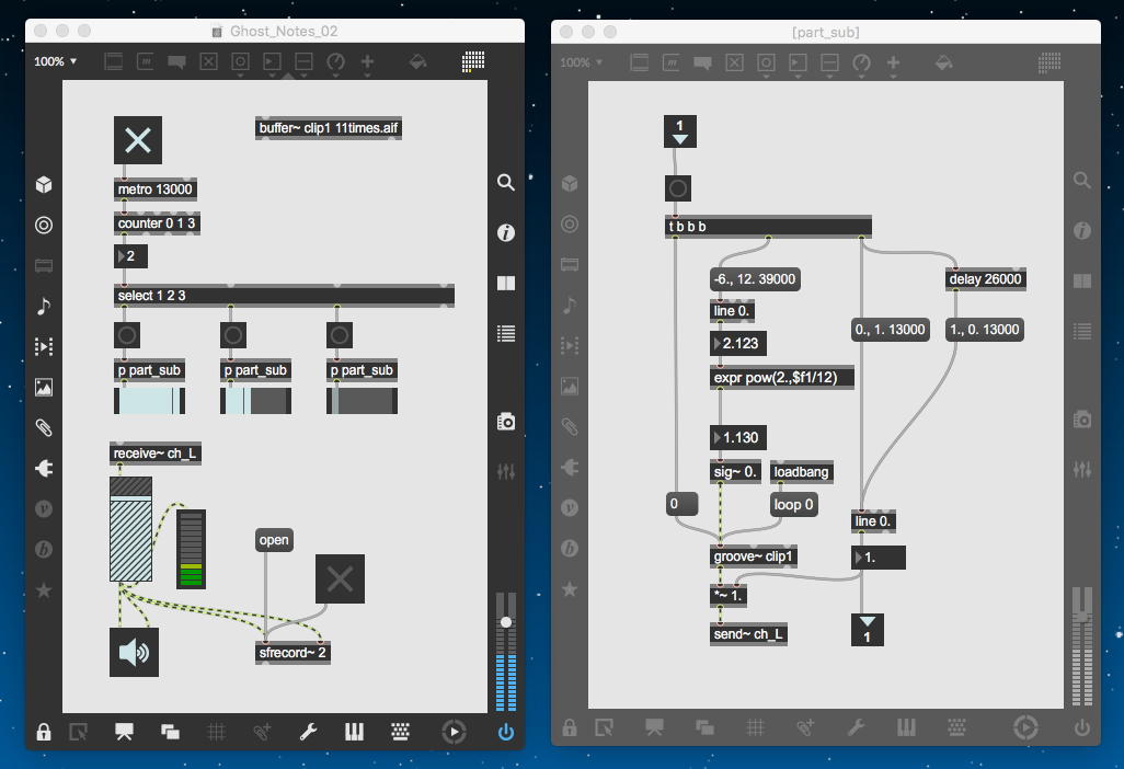 このパッチはまず、「11times.aif」をバッファメモリに読み込んで、まったく同一のサブパッチ「part_sub」を13秒ごとに順に叩くという無限ループになっている。 サブパッチ「part_sub」内では、バッファメモリの読み出しに「groove~」を使うことで、「一定のペースで加速する」という難題を片付けることにした。 つまり、シェパードトーンで「一定の速度でピッチが上昇する」ことを実装するために、「mtof」にlineオブジェクトで線形増加関数を与えたように、「expr pow(2.,$f1/12)」という指数変換式を呼び出すためのlineオブジェクトに「-6., 12. 39000」を与えることで、「6半音下」→「ピッタリ」→「オクターブ上」までに相当するgroove~の相対ピッチ(相対再生速度)を39秒間かけて線形に生成しているのである。