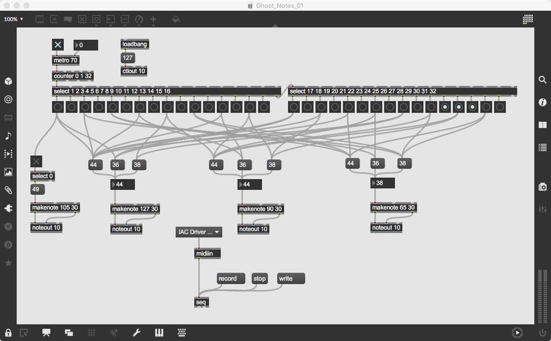 そして、ようやくRisset Rhythmの実験をする時間が作れたので、やってみた。 スタートラインは上のようにシンプルなMIDIドラムのパッチであるが、ポイントは強弱をつけてゴーストノートをたくさん散りばめたところである。 これをseqオブジェクトでレコーディングして45秒ほどのmidiファイルを書き出して、それをQuickTime Player7で読み込んで、適当に11回ほどのループが入るようにトリミングして「11times.aif」というaiffに書き出して、次に以下のようなMSPベースのパッチで読み込むことにした。