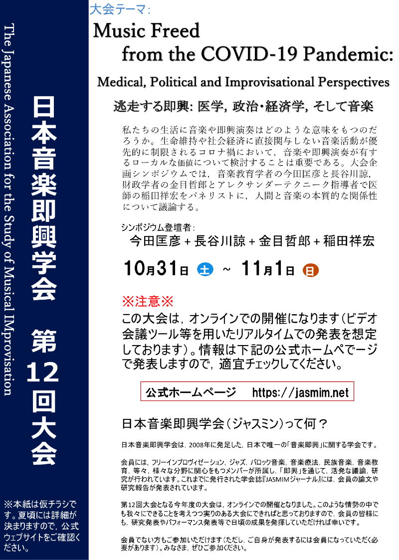 そして久しぶりにギターを愛でていたら、上のような「仮チラシ」とともに、神戸大学という一縷の望みが消えて、やはり「日本音楽即興学会大会」もオンラインだ、というメイルが届いた。 ブルータス、お前もか、という事である。 こうなると、ここでのネタは「コロナと共存する即興」とかいう感じになるのだろうか。 こちらは月末まで応募期限があるので、ちょっと考えてみることにした。