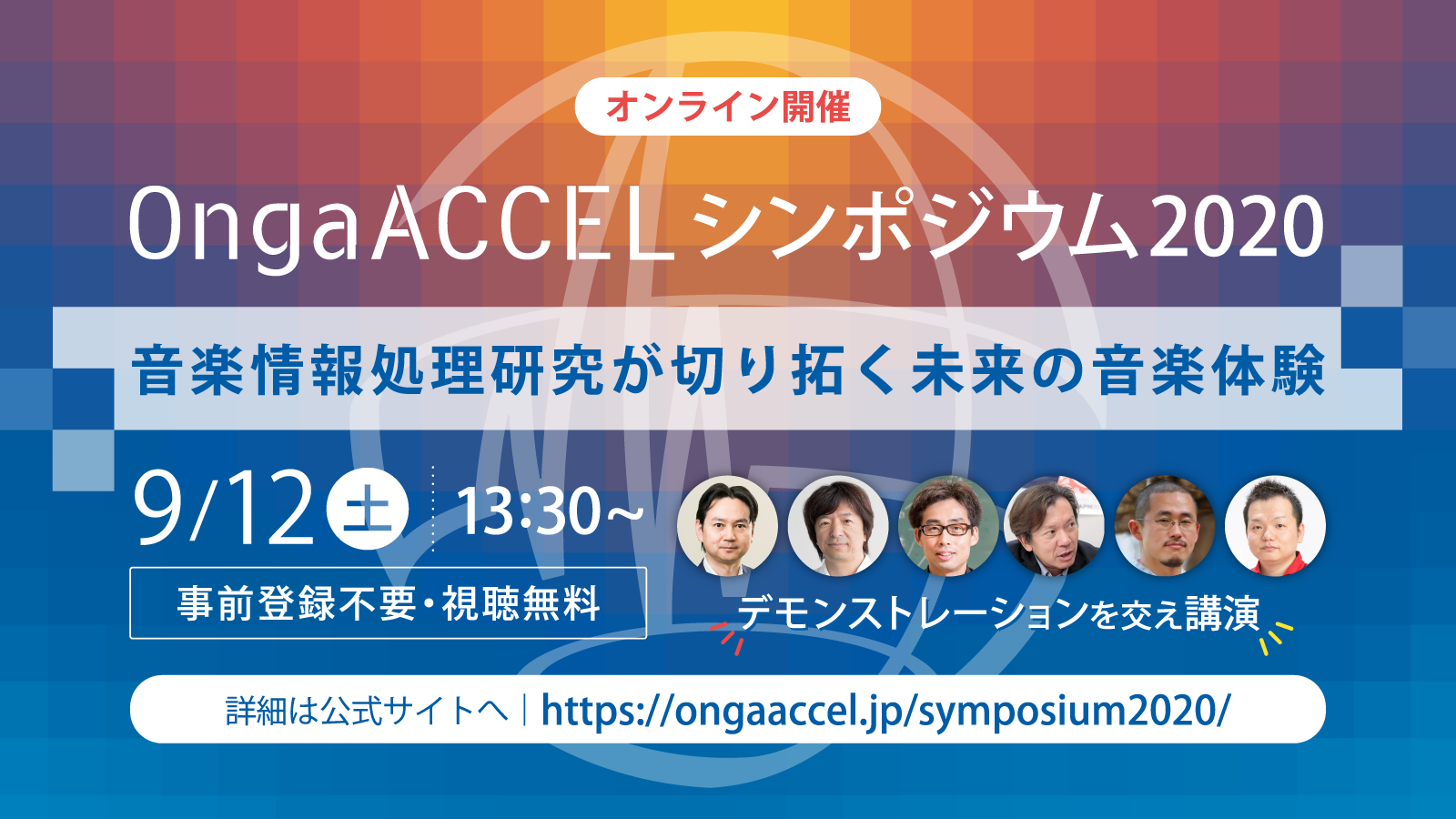 本シンポジウムでは、OngaACCELプロジェクトの研究代表者(後藤 真孝)とプログラムマネージャー(伊藤 博之)、4名の研究分担者(吉井 和佳、森島 繁生、中村 聡史、佐々木 渉)が研究成果のデモンストレーションを交えながら講演します。