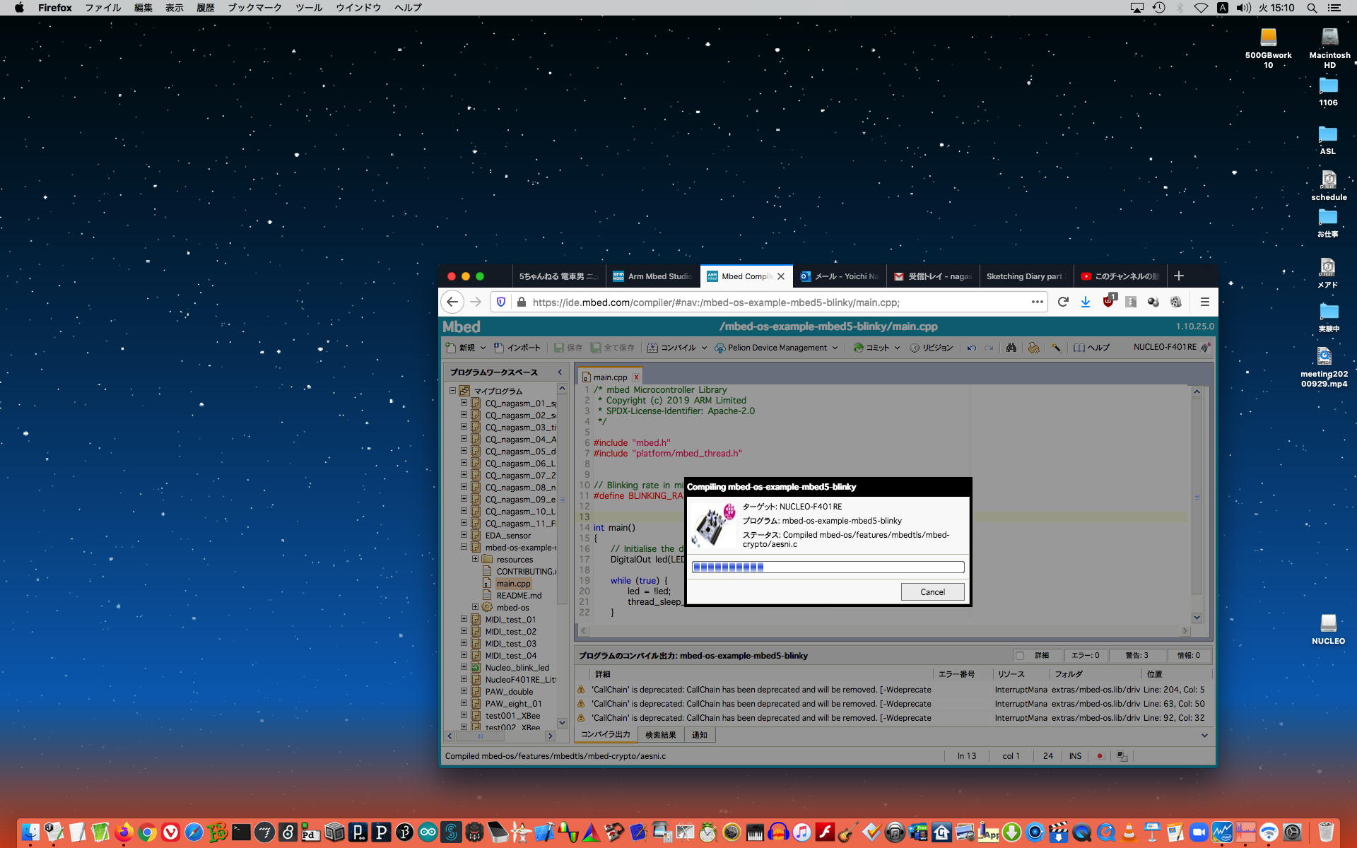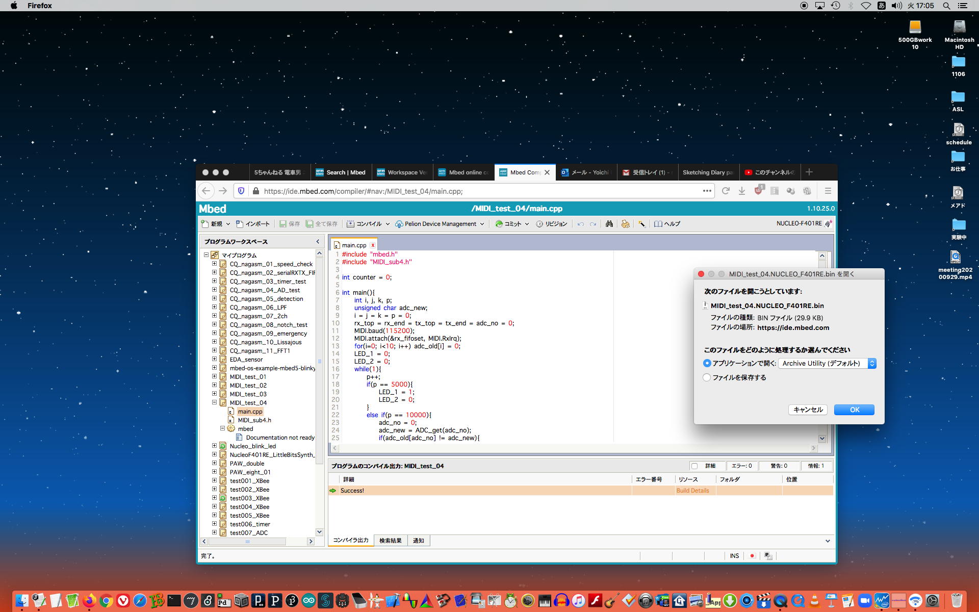 その後、帰る前にあと少しやってみよう・・・と、mbedのサイトで、出てきたエラーメッセージから検索をかけてみると、 Mbed online compiler problem - compilation needed after long time と、まさに僕と同じように悩んだデベロッパのトピックがあった。 そしてその中で「I solve the problem by removing and reimporting the mbed library.」という記述を見つけて、駄目モトでやってみると、なんとなんと 過去のプログラムでコンパイル成功する方法 というのを発見してしまった。 上はその様子である。 このYouTube には、2つの「過去に開発したNucleoF401REプログラム」について、 (1)コンパイルをしたらエラーが出た、(2)ライブラリを最新にアップデートした、(3)コンパイルしてみると成功した!! という流れを記録してみた。 どうやらこれで、「過去に開発したNucleoF401REプログラムは今後も使える」・「過去のプログラム手法を今後も発展できる」という重要な確認が出来たことになる。 ゼミでの手応えもあった朝から始まって、なんとも充実の実感に溢れた1日となった。(^_^)