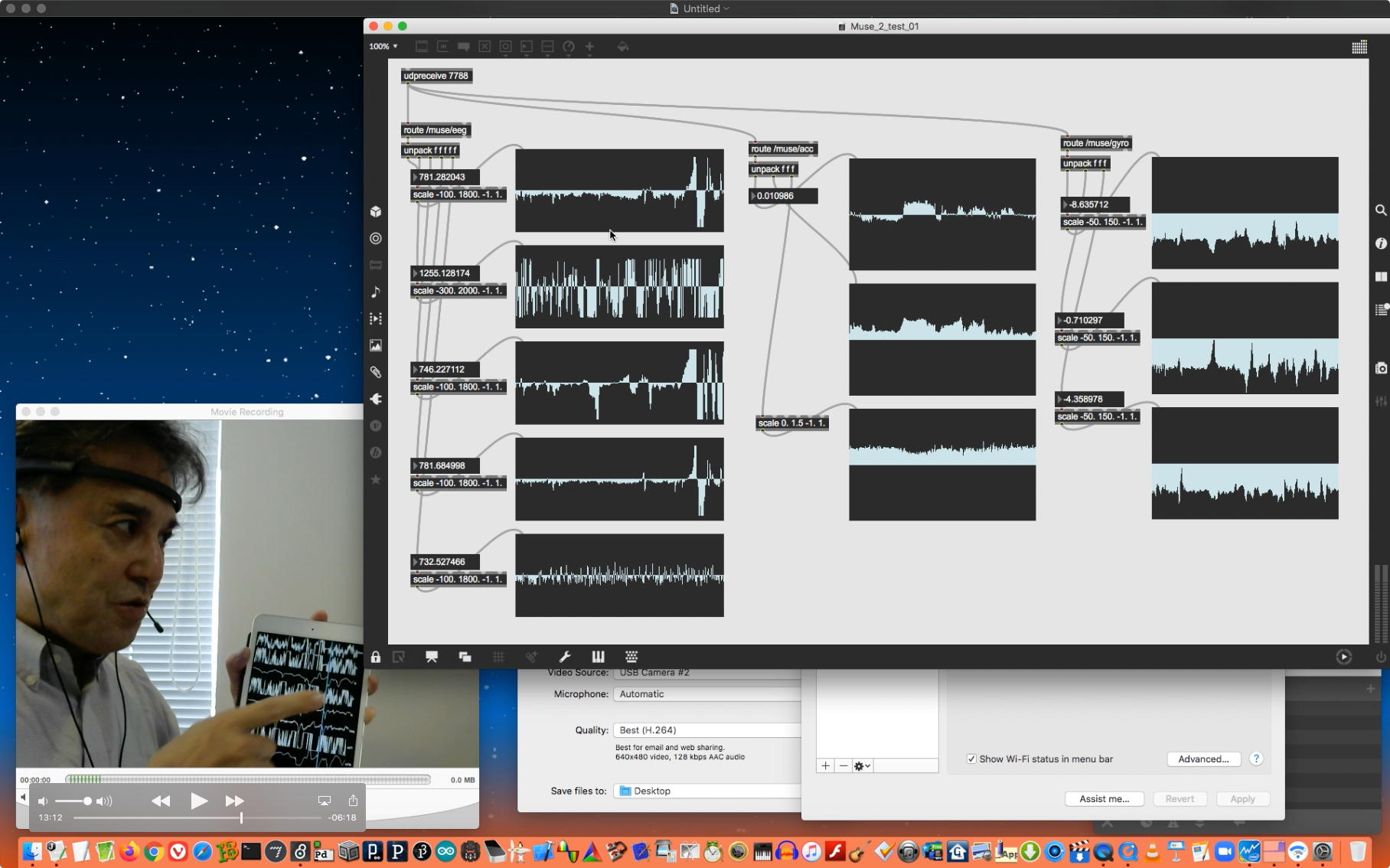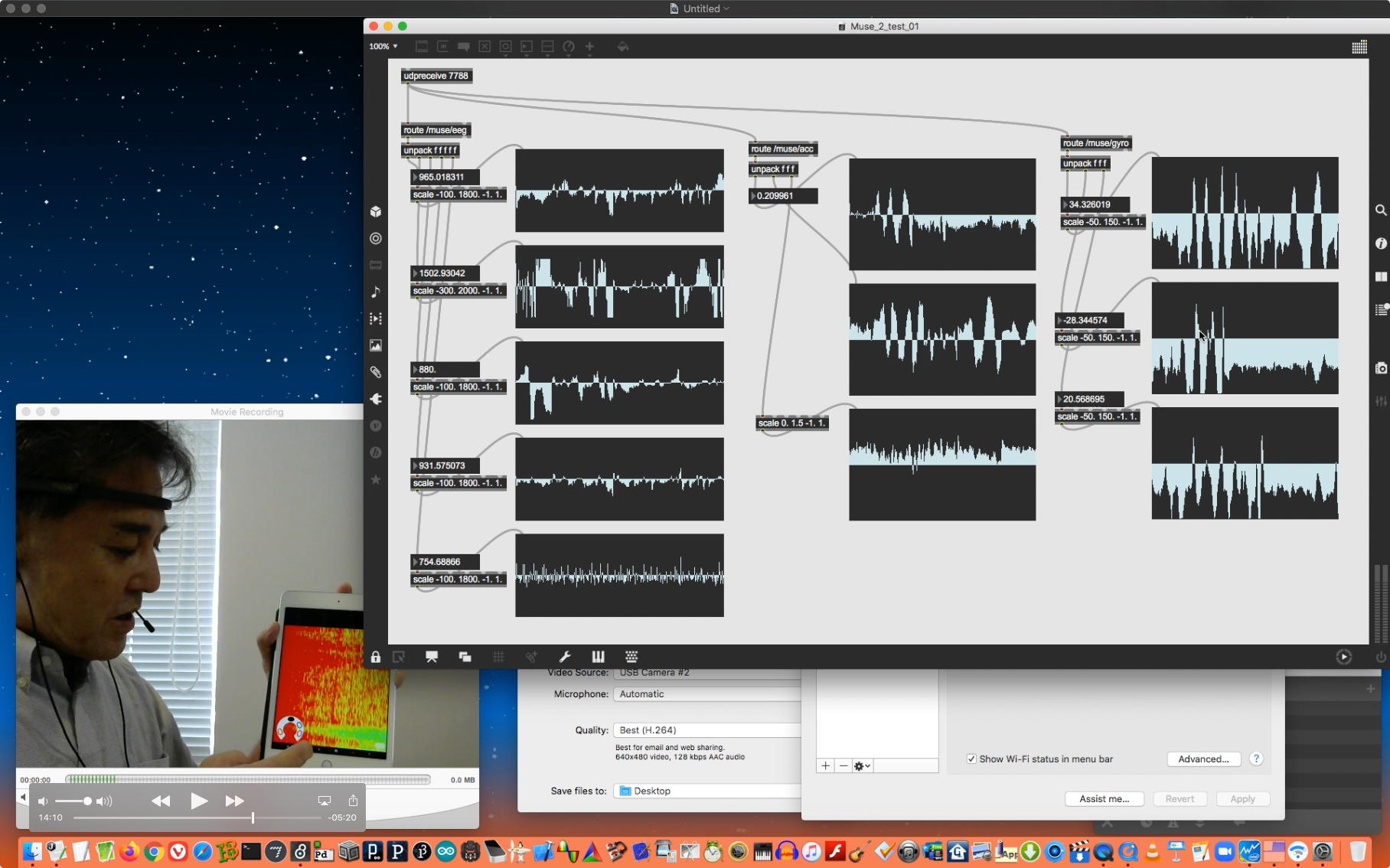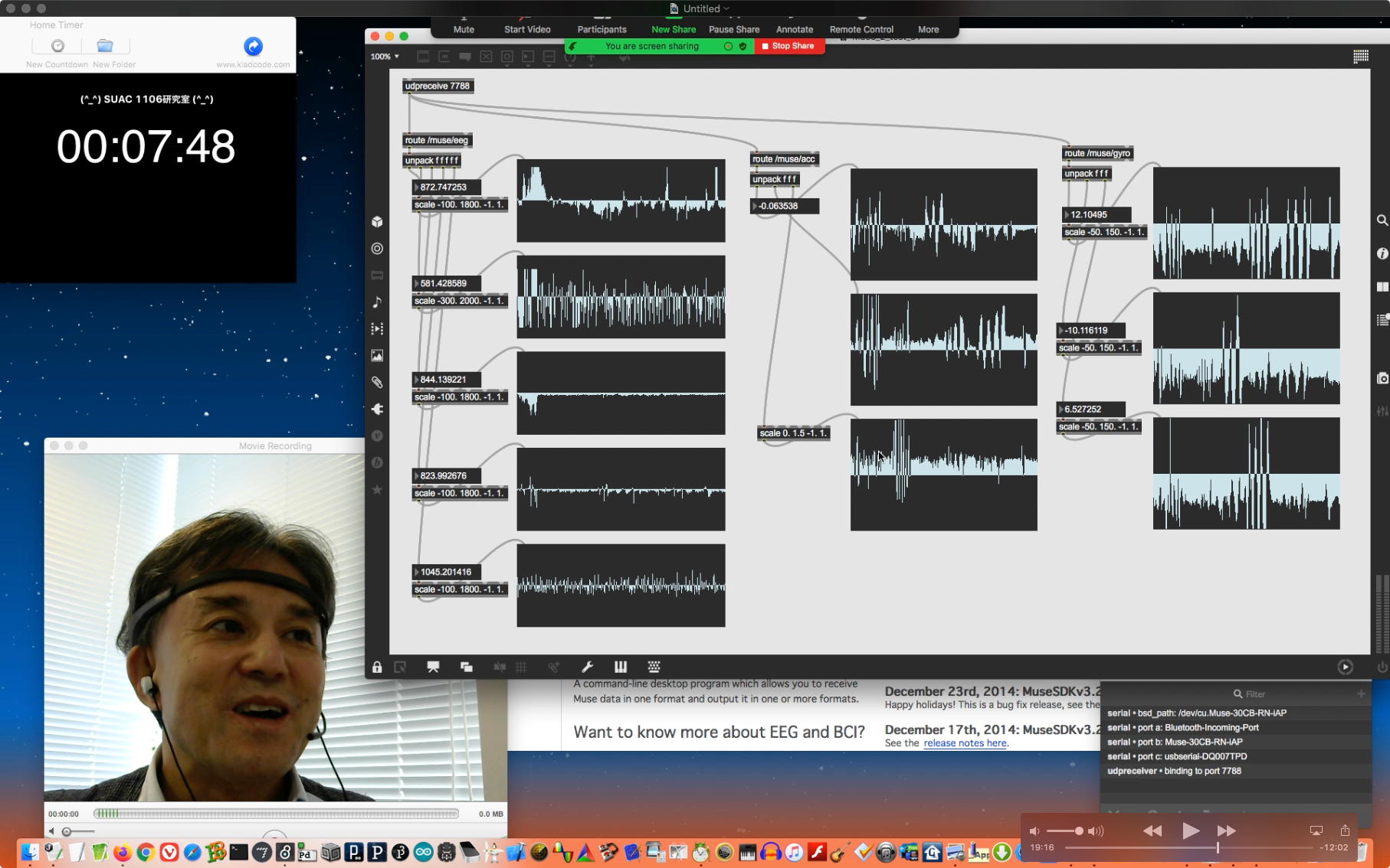 今朝フト思いついて、今回はライヴ性を重視して、OpenBCIをかぶってMax8で脳波を見せたり、Muse2で表示しつつサウンドを鳴らして「心拍を落とす技」を初めて公開してみたが、どうやら無事に心拍はサッと低下してくれたらしい。 まぁ、これは十分にパフォーマンスとしては成功ではないだろうか(^_^;)。