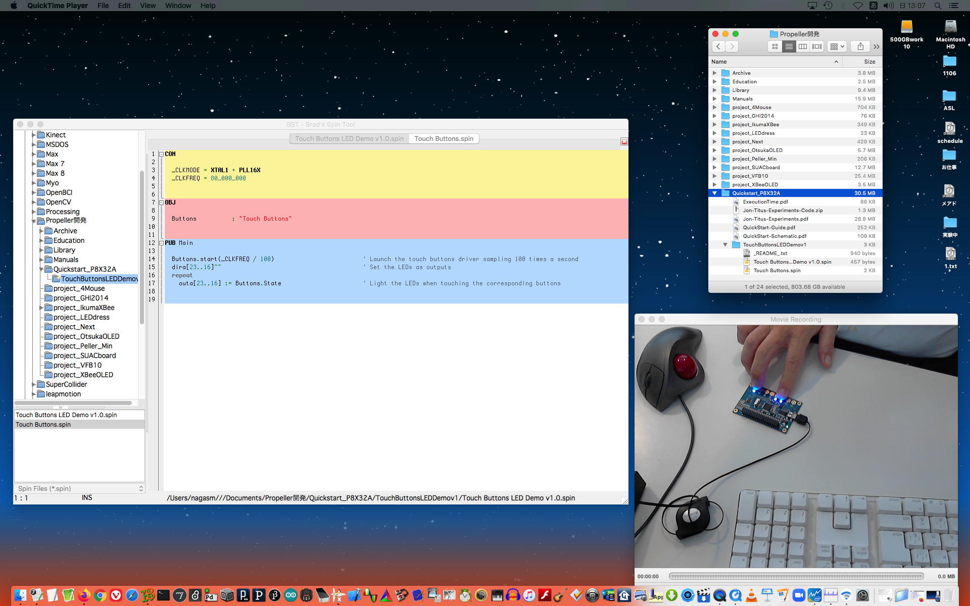 そこで P8X32A Propeller QuickStart (Rev.B) のページの「Download & Documentation」から、 QuickStart-Guide.pdf と QuickStart-Schematic.pdf と ExecutionTime.pdf という技術資料をまず、ゲットした。 さらにちょうどいいサンプルプログラムとして Touch-Buttons-LED-Demo というのがあったので、さっそく久しぶりのIDE「bst」でやってみると、ものの数分でアッサリと「スイッチ電極を触るとLEDが光る8つのチャンネル」をコンバイルする、というデモが このように 出来てしまった。