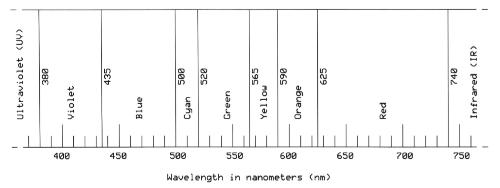 第1章では15ページから32ページまでかけて、LEDについて、これでもかという程に詳しく解説してある。 「基礎演習E」の的場さんの回では、LEDにボタン電池(3V)を繋いで点灯させているが、これは電子工学的にはちょっとあまりに安易であることが、この章の解説から理解できる。 LEDのメーカが提供するデータシートの読み方から始まり、LEDの光の指向性、以下のような電磁波の「波長」と「色」の関係、アノードとカソード、順方向電圧と電流制限抵抗、電圧と電流との関係、LEDの色ごとに必要な順方向電圧、電流制限抵抗を色々に変えてのLED点灯実験、関連して抵抗器の電力容量、などなど、まぁこれは基本の基本であるものの、ここまでちゃんと理解しなくても活用できるLEDについて、徹底的に解説している。 PDP-8を開発していたような時代には、LEDという部品も安定していなかったので、そういう時代背景の迫力が伝わってきた。