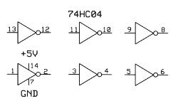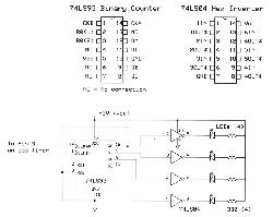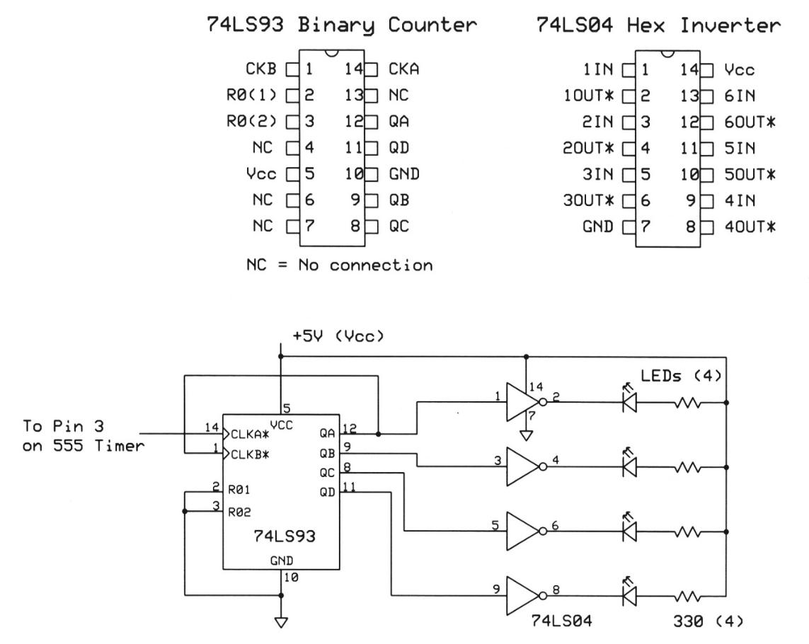 ここから話は上のように、「555」の出力と反転出力に2個のLEDを付けると、そのデューティ比が等しくない、つまりディジタルといっても方形波である事を説明して、555の出力にJ-Kフリップフロップ74LS76を繋いで、きっちりとデューティ比が50%の矩形波になる・・・という方向に進んでいく。 74LS76というのは僕の研究室の部品棚には無くて、74HC74というか74HC174とか74HC374などがある。 そして2個のLEDから今度は4個のLEDを点灯させるために、2個のF/F(フリップフロップ)の入った74LS93で2段カウンタとして、2ビットの2進数に相当する表示をするとともに、LEDを負論理(ディジタル信号が[L]で点灯、[H]で消灯)であるためにインバータの74LS04によって反転させる、以下のような回路に到達する。 こういう実験は、まさにサラリーマン時代、河合楽器の研究開発センターに配属された新入社員時代に、最初にやった気がする(^_^)。