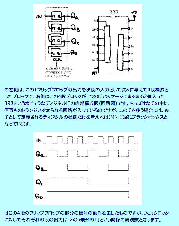 テキストではその後、「Digging Deeper into the 555 Timer Circuit」という解説で、伝説のICとも言える「555」の内部について、詳しく解説している。 また、7493を2段接続して、合計で8ビットのバイナリカウンタを構成した回路を紹介しているが、これは僕がテキスト センサとマイクロエレクトロニクスの概要 の中で、74HC393を使って紹介した以下の回路とまったく同じものになっている。(^_^)