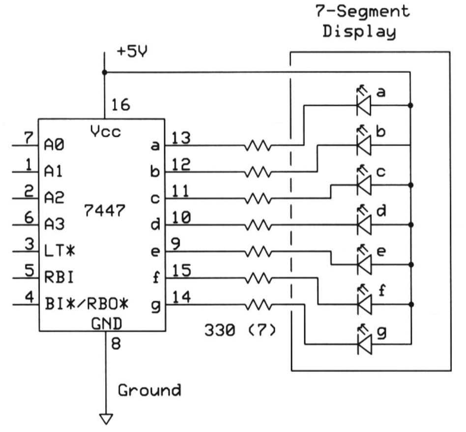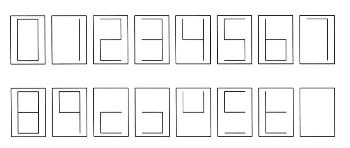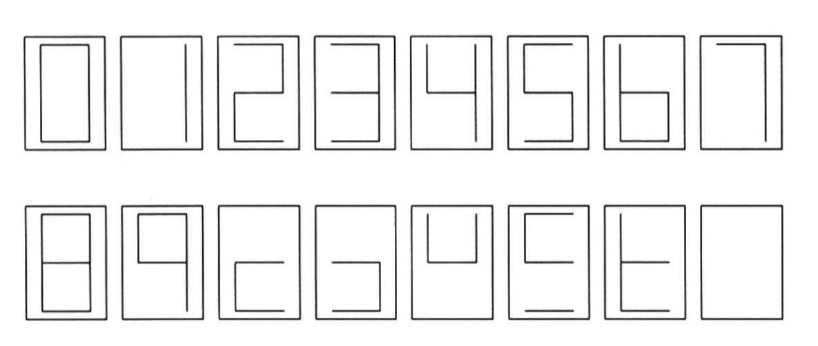 第3章では、前章で作ったカウンタの出力を表示するディスプレイデバイスとして「7セグメントLED」が登場する。 今の学生にはピンと来ないかもしれないが、現在のようなフルドット・ディスプレイが登場する前にあったのは「7*9ドット」など、LCDモジュールでお馴染みのドットマトリクスLCDだったが、その前にはさらにドット数が減って、以下のようなたった7個のLEDで「0」から「9」までの数字を表示する、という、エレベータの中などでいつも見ているアレである。もう少し増やして「米」のようにして、読みにくいながらアルファベットまで出来ものもあったが、とにかくこのディスプレイは、人類史において相当に長い歴史を持っている。