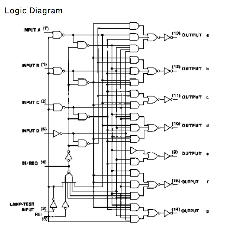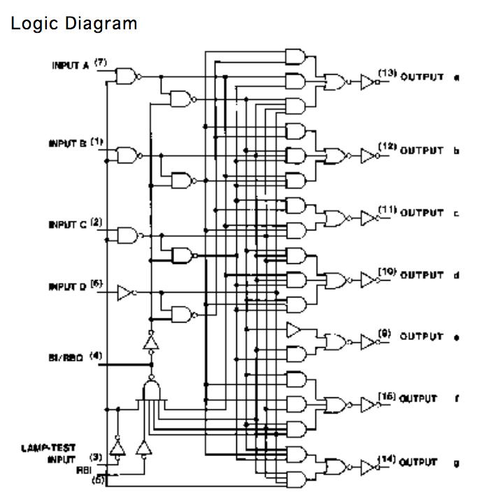 人間が「数字」と読み取れる情報をたった7個のセグメントに変換したデザインも凄いが、その並びは2進数であるディジタルの数値表現とはまったく関係ない。 7セグメントの図をたくさんコピーして、いちいち「0」ならコレとコレ、「1」ならコレとコレ・・・と対応表を作ってみれば分かるが、それを基礎的なディジタル電子回路(ANDとORとNOT)で構成すると、とっても面倒になる。 そこで当時は、「4ビット2進数の入力」→「7セグメントのLED表示」というのを実現するための専用ICが登場した。 これが以下の7447であり、その内部回路は以下のようになっている。