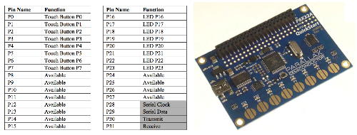 そして第4章で、ようやくMCUとしてPropellerが登場する。 最初に一般的なマイコンについての概説があるが、これは僕もあちこちに書いてきたし、まぁ目新しいところはない。 Arduinoのサイトでもmbedのサイトでも、どこでも解説しているものである。 その後、満を持して、以下のように「P8X32A QuickStart board」が颯爽と登場して、ピンのアサインが紹介されている。 PropellerではP0からP31までの32ビット(内部に8個の32ビットCPUがあって並列動作する)の全てのピンがピンヘッダから出ているが、P28とP29は外部に置いたプログラム格納用EEPROMアクセスのために、またP30とP31はホストから通信する(→プログラムをRAM/EEPROMにダウンロードする)ために、それぞれ予約されていて、実質的には28ポートが完全に使用できるが、この「P8X32A QuickStart board」ではP0からP7が8ビットのタッチスイッチ用に、またP16からP23が8ビットのブルーLED表示用にハードが接続されている。