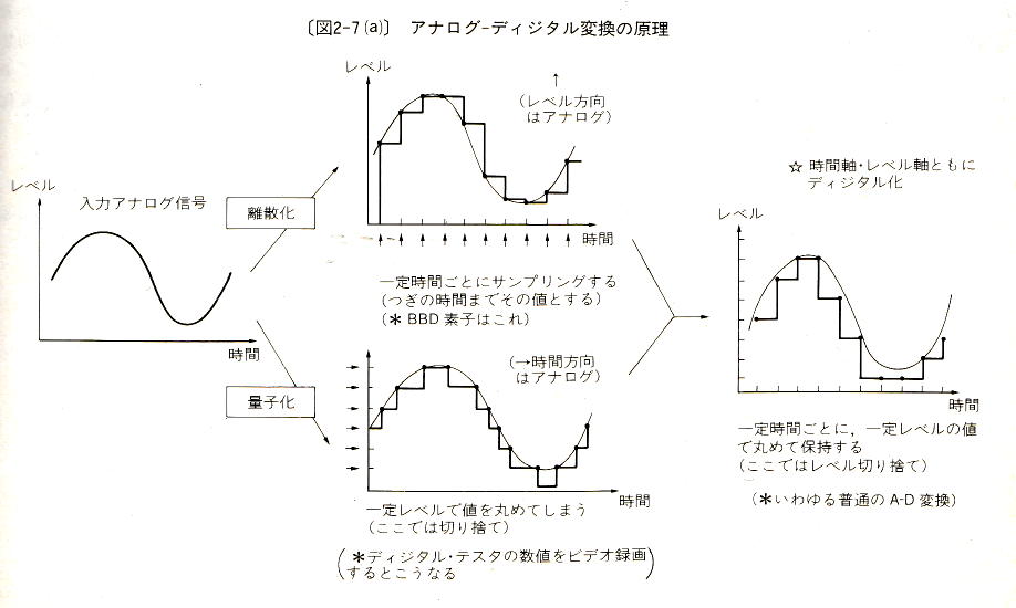 そして上のように「555」というICを紹介して、外付けの2個の抵抗と1個のコンデンサの充放電で連続的に上下する電圧が、スレショルドとトリガによってディジタル的に「H」か「L」の2値が出力される原理を解説して、さらに実際に抵抗とコンデンサとLEDを繋いだ回路での点滅を体験する。 解説では時定数から周波数の計算方法も紹介されているが、まぁこれはブレッドボードでカットアンドトライしたり、ポテンションメータ(半固定抵抗)で可変にするので、計算なんてのはしなくても大丈夫である(^_^;)。 「OPTIONAL」として、色々な単位についてのdimension解析の解説もあるが、まぁここもとりあえずはスキップしても何も困らない。 僕がこのあたりをやった時には、たぶんまだ世の中に「555」が出ていなかったのか、記憶にあるのも手元にあるのも、VCO(電圧制御オシレータ)の 74HC123 とか 74LS124 とか 74LS624 とかだったので、あまり実際に555を使った記憶はない。 全てAKI-H8などのマイコンでやってきたからである。