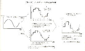 第2章では16ページから51ページまでかけて、ディジタルの基礎の部分をザッと駆け抜けている。 タイトルは「555でLEDを点灯させる」だが、実質的にはディジタル回路に関する総ざらえである。 話としてはまず両端に電圧計を付けたコンデンサに抵抗を経て電源を供給するところにスイッチを入れて、「ONすれば電圧は次第に電源電圧まで上昇」・「OFFすると電圧は次第にGNDへ」ということで、これを繰り返すのがディジタルだ、と解説。