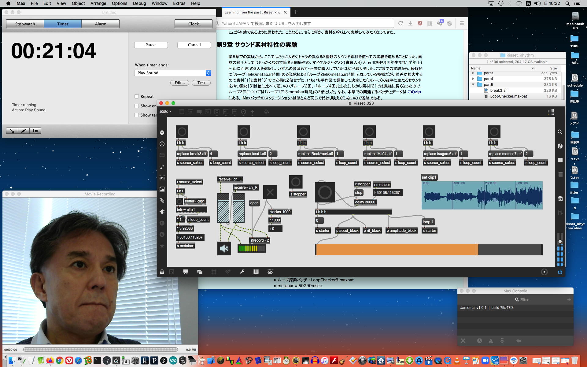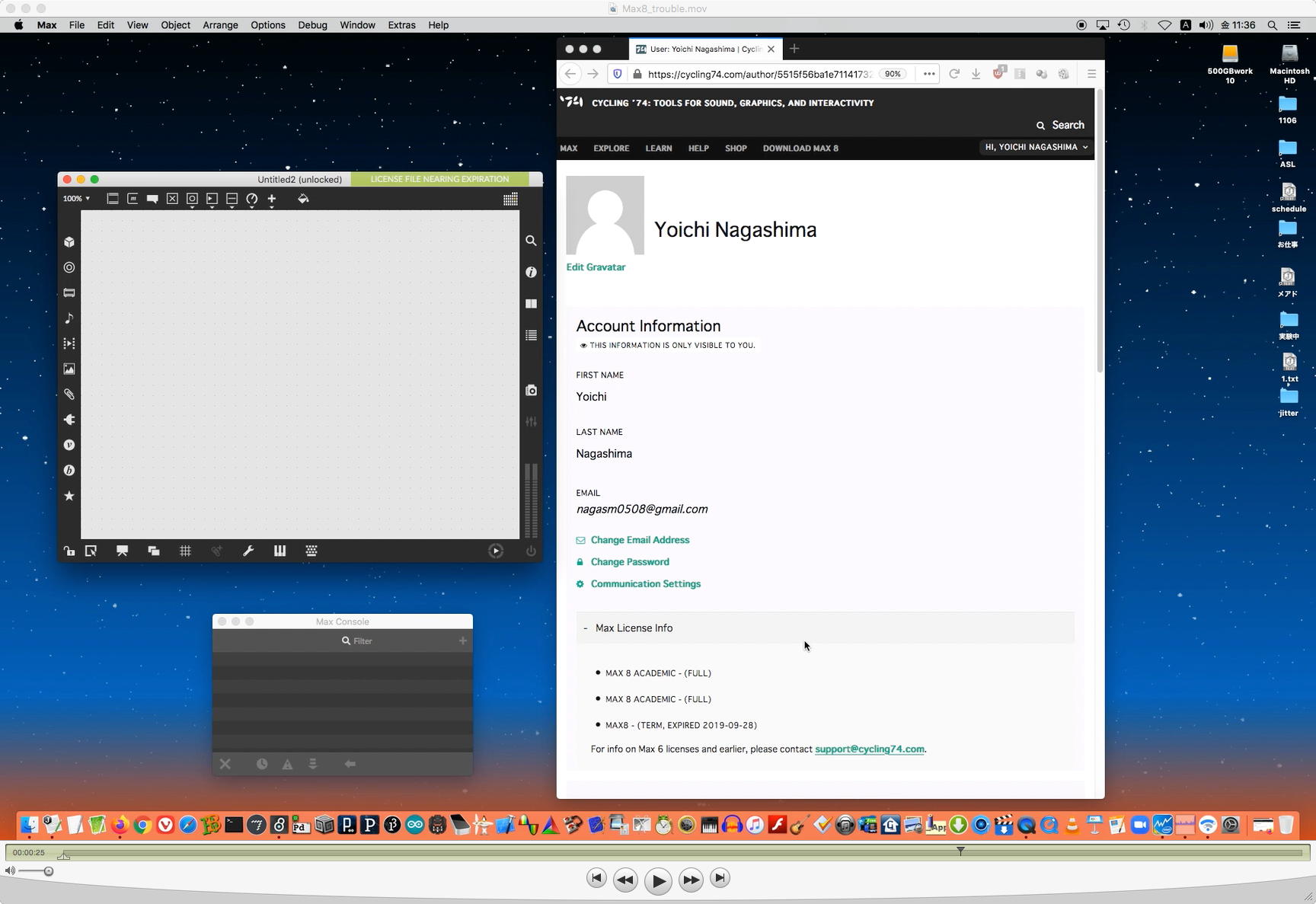 この日は、Max8のトラブルに関して、ちょっとした進展があった。 何度もやりとりしていたCycling'74のスタッフからのメイルが届き、どうも「SUACのfirewallがCycling'74のサイトへのアクセスだけブロック(低速)している?」という疑惑が表面化した。 そこで、実際の様子を記録した動画を紹介したり、情報室のスタッフと相談したりしたが、たまたまその時には「出なかった」筈のMax8オーソライズ画面が、もの凄い遅れとともにうっすら出てきたりして、ちょっと動揺した。(^_^;)