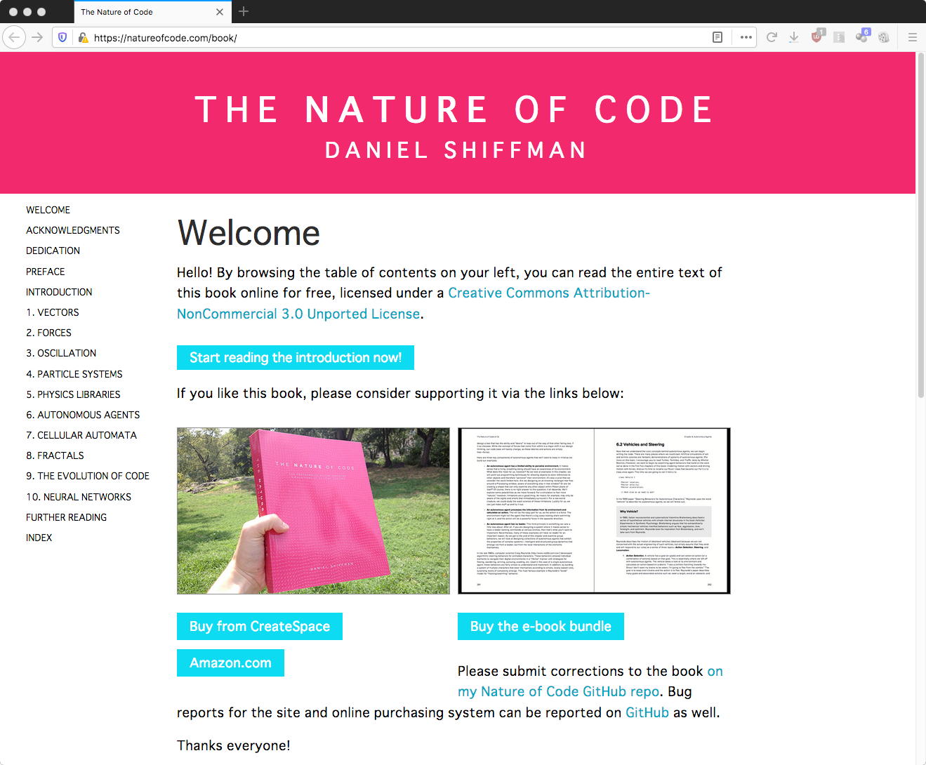 明日にはゼミ杉山さんのアポがあったり、水曜日にはかわゼミの学生のアポ(カレンダーを制作するということで、OGの山村知世さんのカレンダーを見せる)もあったりするが、今日はぽっかりと時間が空いているので、ここで The Nature of Code をさらにチラッとやってみることにした。 テキスト をザッと眺めた感じでは、以下のような章立てであり、すでに第4章のパーティクルまではザッとこの日記でも書いていたので、その続きの第5章「Physics Libraries」から眺めてみることにしよう。 サンプルスケッチ の該当するものを走らせては考える・・・という感じとなる。 テキストの翻訳は全てDeepL翻訳に丸投げしたコピペである(^_^;)。
