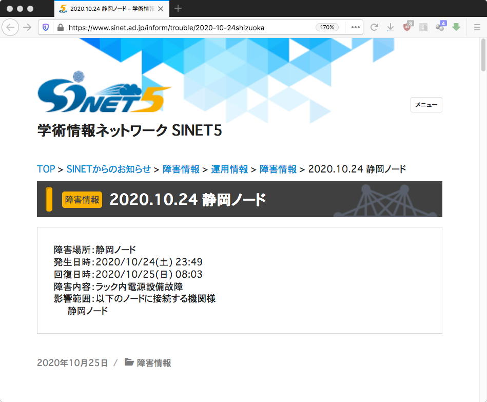 僕は自宅にパソコンを置かず(ネット環境も無い)、スマホも持たず、つまり大学の研究室にいる時や出張中(空港・駅・ホテル等のWiFi利用)を除いて、ネットアクセスどころかメイルすら届かない(読めない)、というのが、20年以上続いている生活の基本である。 そこで、休日(土日・祝日)も出張等の予定が無い限り、必ず自宅から研究室に出てくる(クルマで10分ほど)日々をずっと続けているので、COVID-19で出張がゼロとなった2020年3月からこの9ヶ月間、完全に「毎日1106研究室にいる」日々が続いてきた。 しかし、爆破予告で入構禁止という異常事態のため、今日は9ヶ月ぶりに研究室に行かず、こうして自宅の居間で、研究室から持ってきたMacBookAirと遠隔対応のために研究費でレンタルを継続しているモバイルWiFiルータ(超低速/極小データ量)でネットをアクセスして、この日記のHTMLを手元にダウンロードして改訂してサーバに上げている。 明日にはこのHTML等を研究室のお仕事Mac miniのマスターデータにコピーしないといけないので、こんな面倒なことは今日限りである。