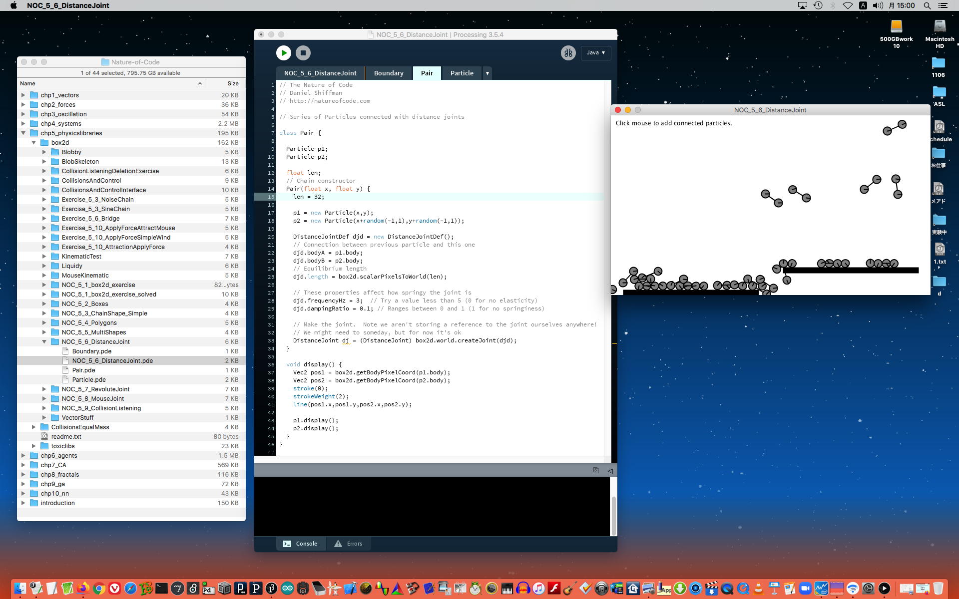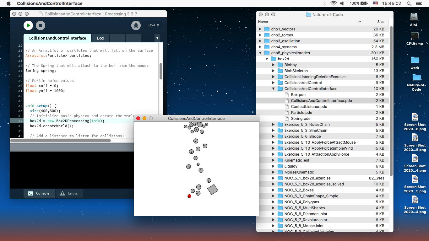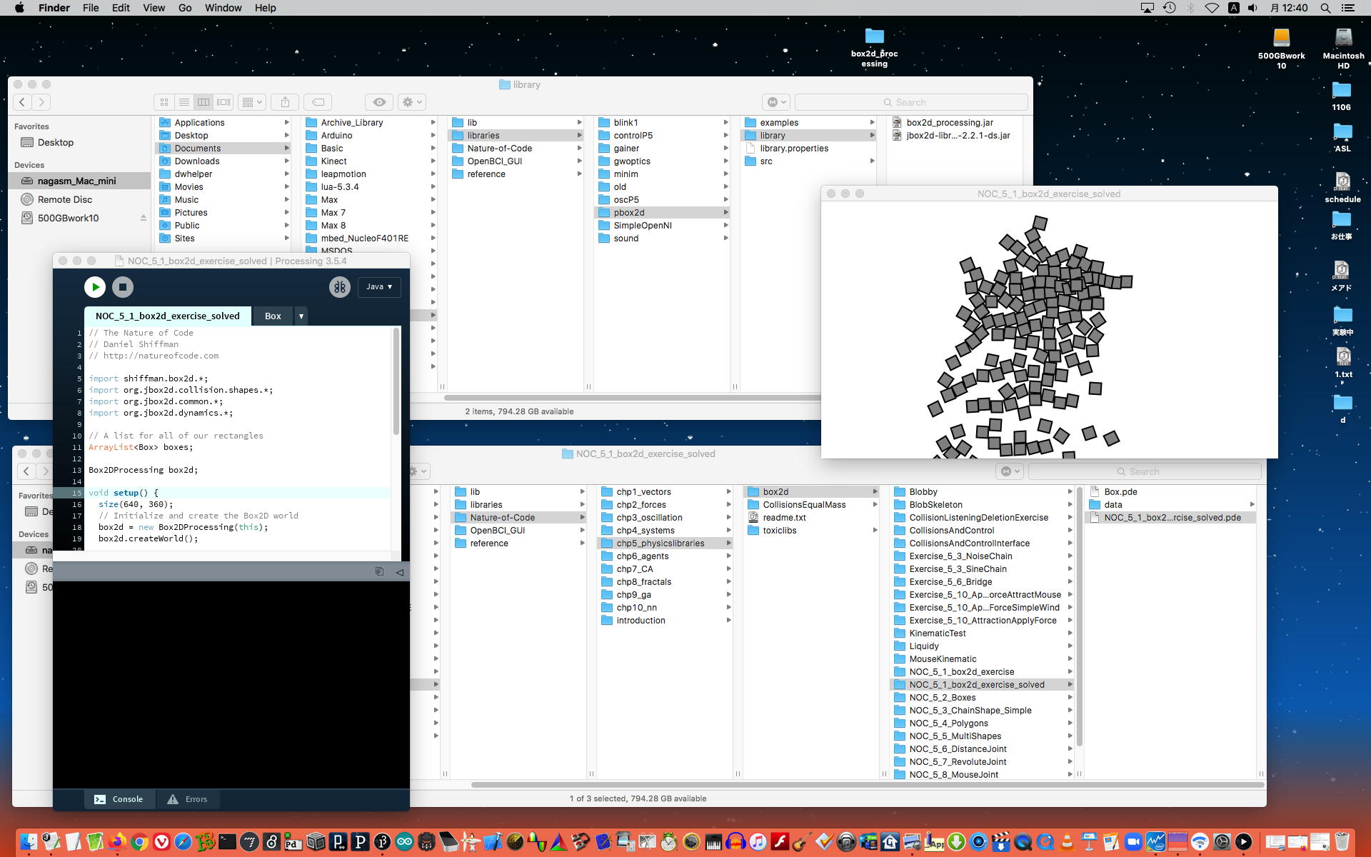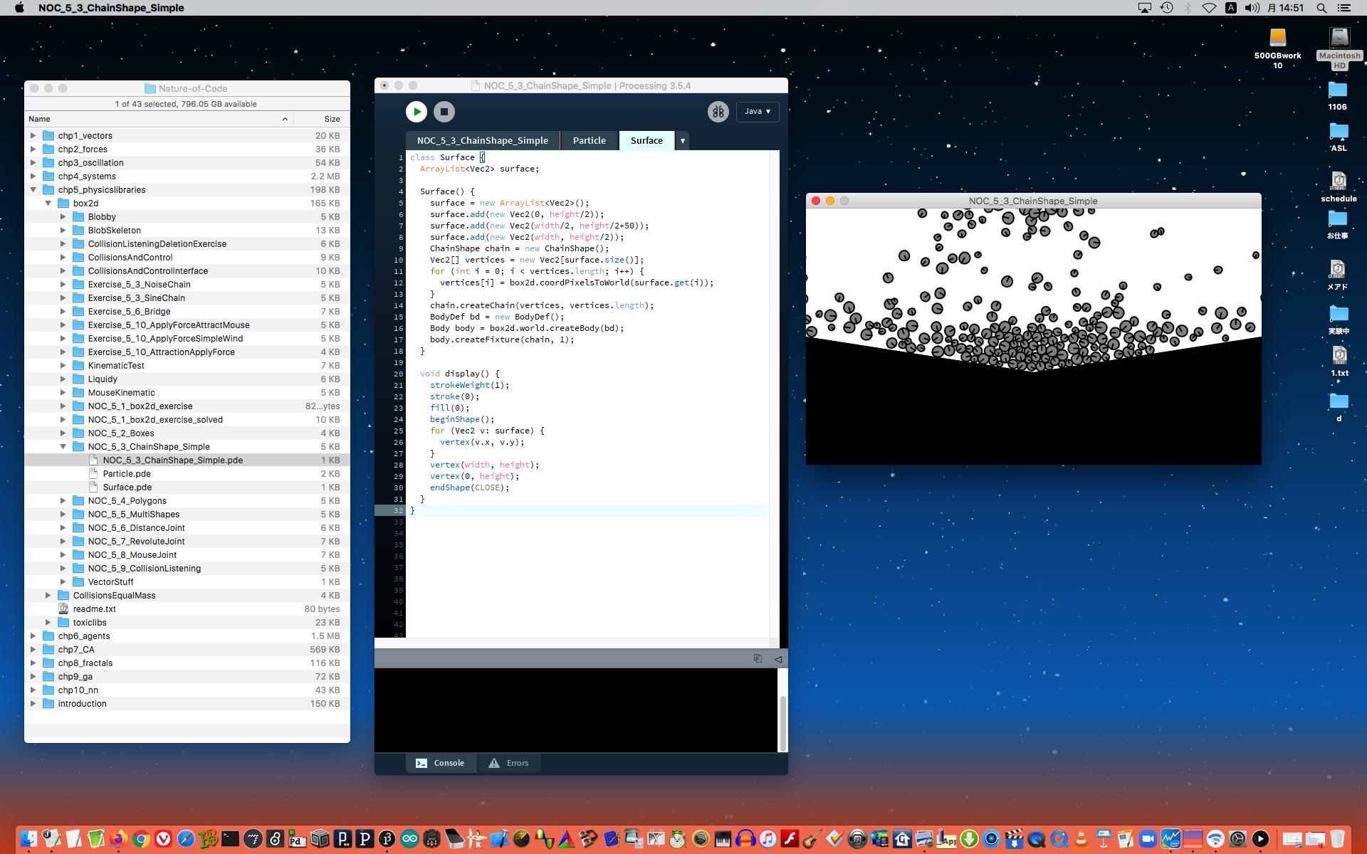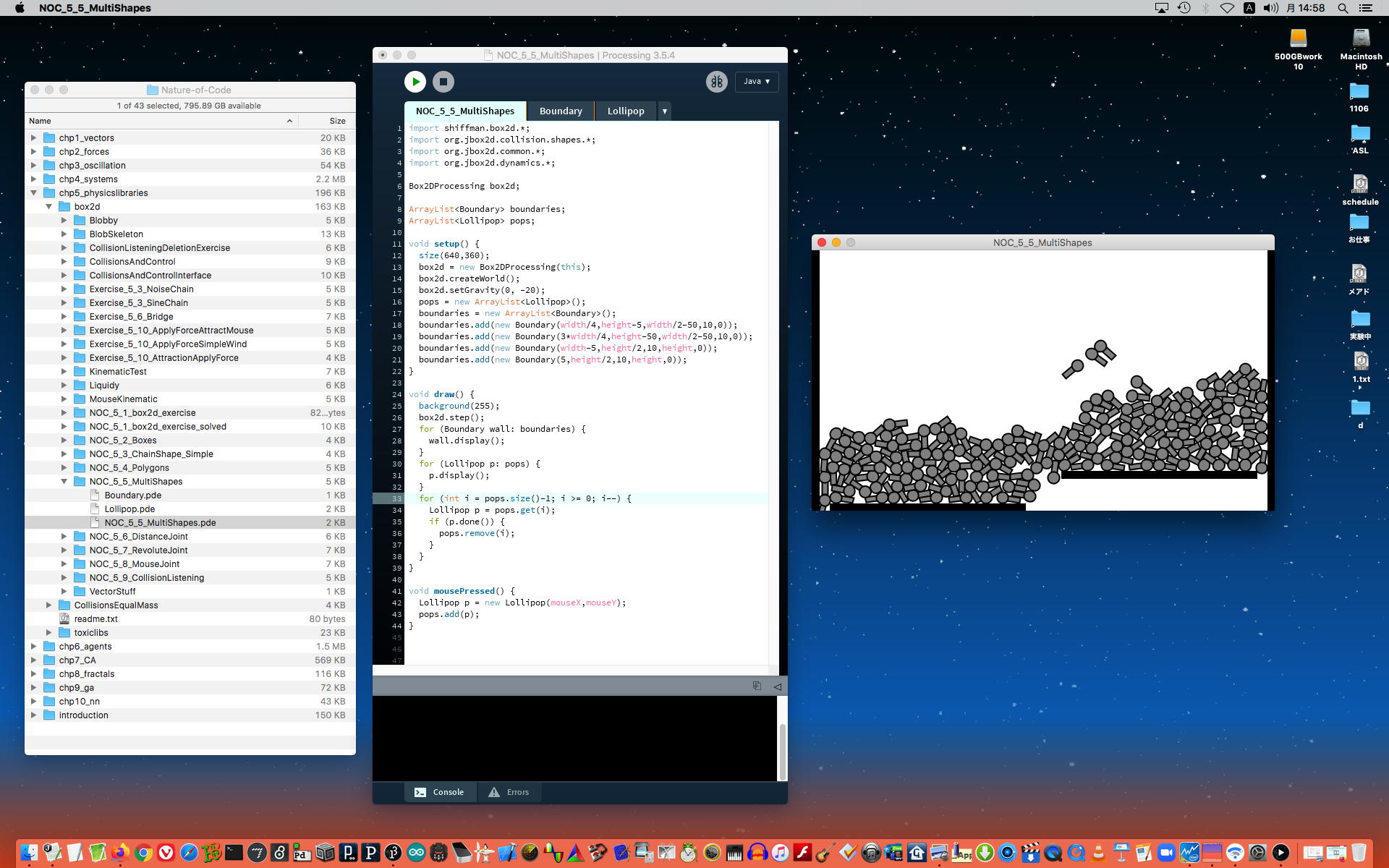 かなり「対症療法」的な対応であるが、とにかくテキストのサンプルが実際に走るというのは重要なのだ。 しかしその後、上記の「box2d_processing を pbox2d にリネーム」というのは実は不必要な間違いと判明して、「box2d_processing」を「libraries」の直下に置いて、上記の3点のProcessingソースの置換だけでエラー無く進められることを確認した。 その後はサンプルを次々に試してみたが、これはかつてゼミでやった「Unity勉強会」のデジャヴみたいなもので、要するに各種の物理モデルの綺麗な振る舞いに感嘆する・・・という感じの楽しい時間となった。