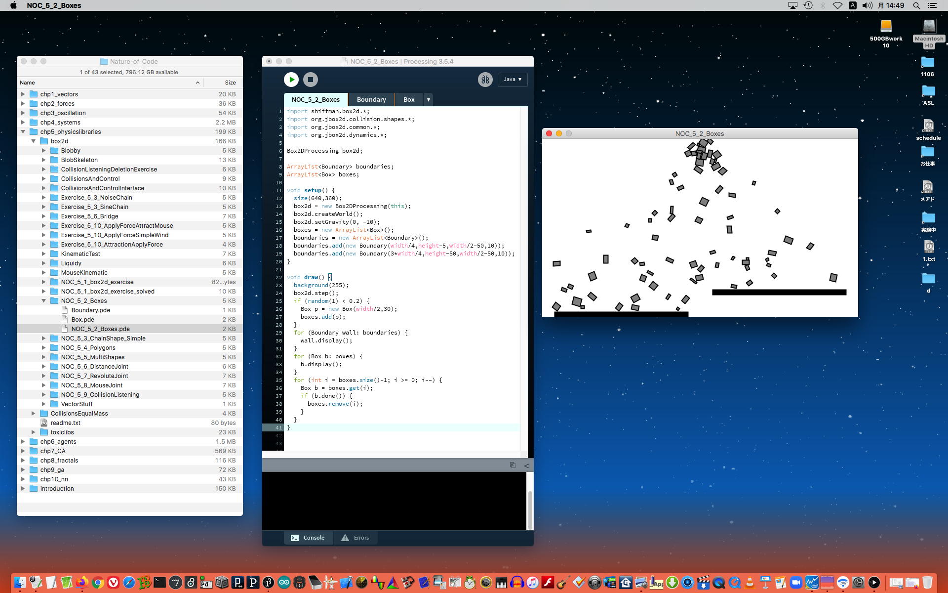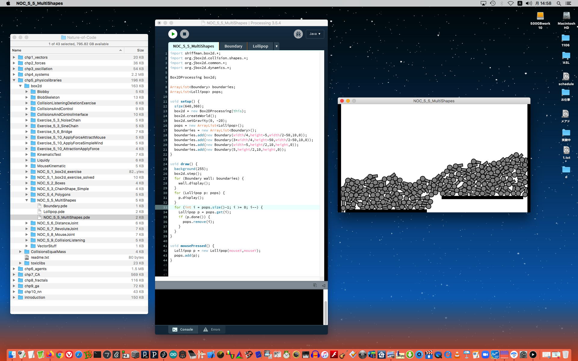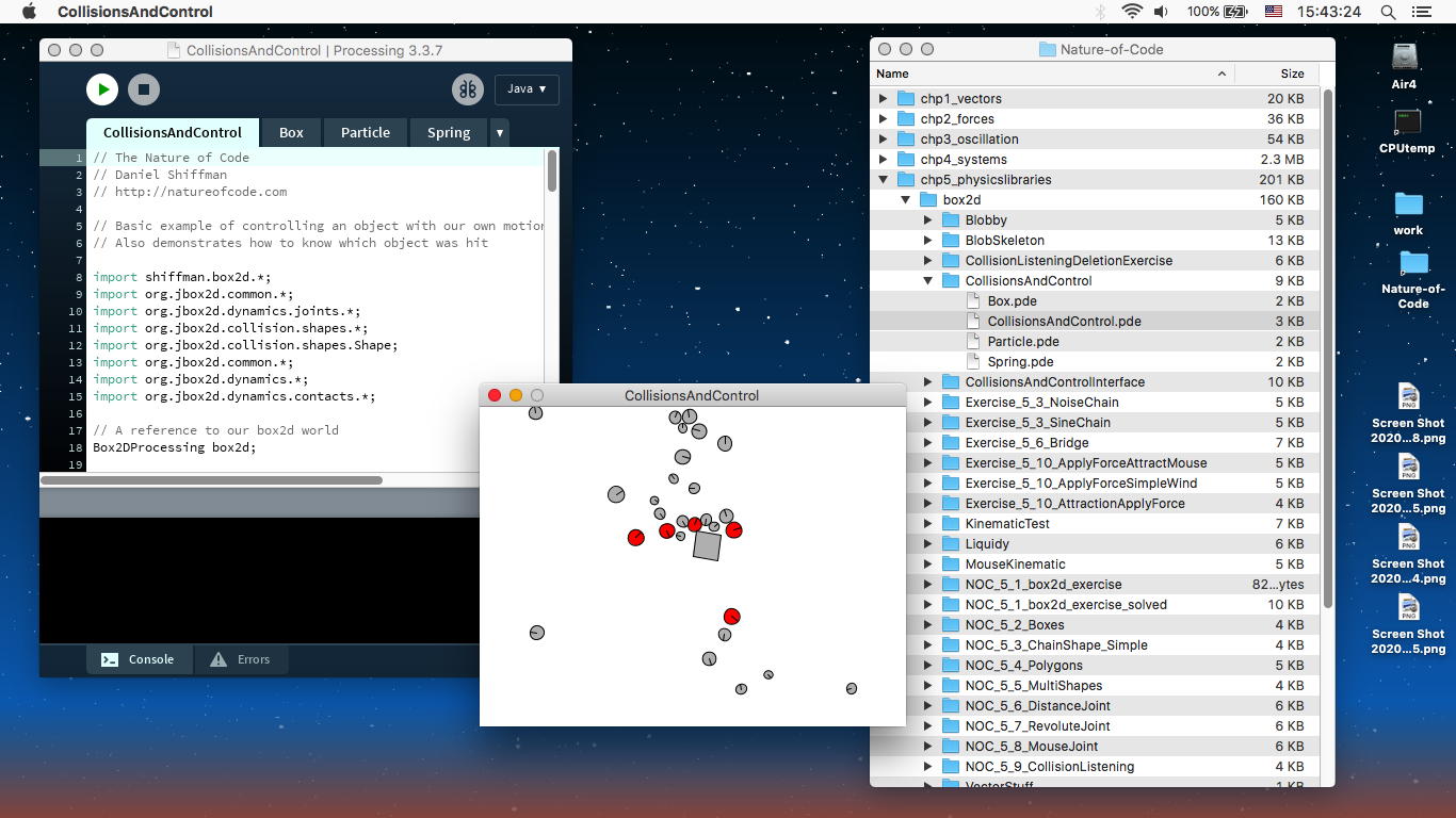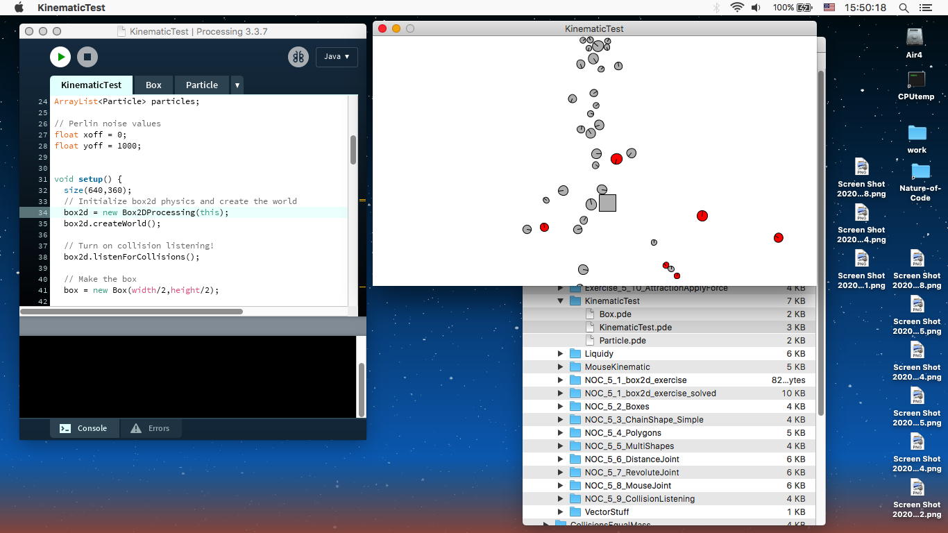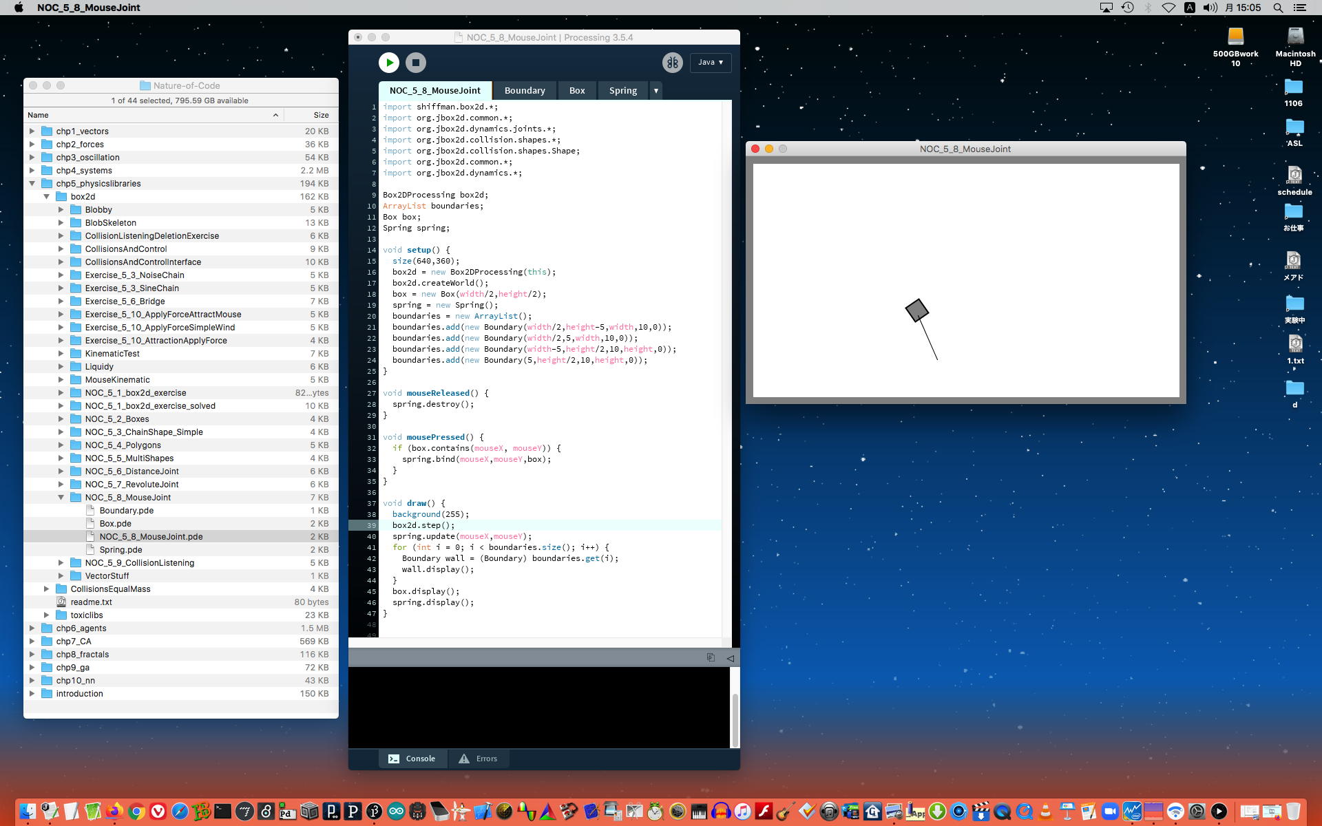 かなり「対症療法」的な対応であるが、とにかくテキストのサンプルが実際に走るというのは重要なのだ。 しかしその後、上記の「box2d_processing を pbox2d にリネーム」というのは実は不必要な間違いと判明して、「box2d_processing」を「libraries」の直下に置いて、上記の3点のProcessingソースの置換だけでエラー無く進められることを確認した。 その後はサンプルを次々に試してみたが、これはかつてゼミでやった「Unity勉強会」のデジャヴみたいなもので、要するに各種の物理モデルの綺麗な振る舞いに感嘆する・・・という感じの楽しい時間となった。