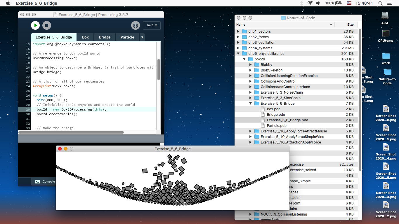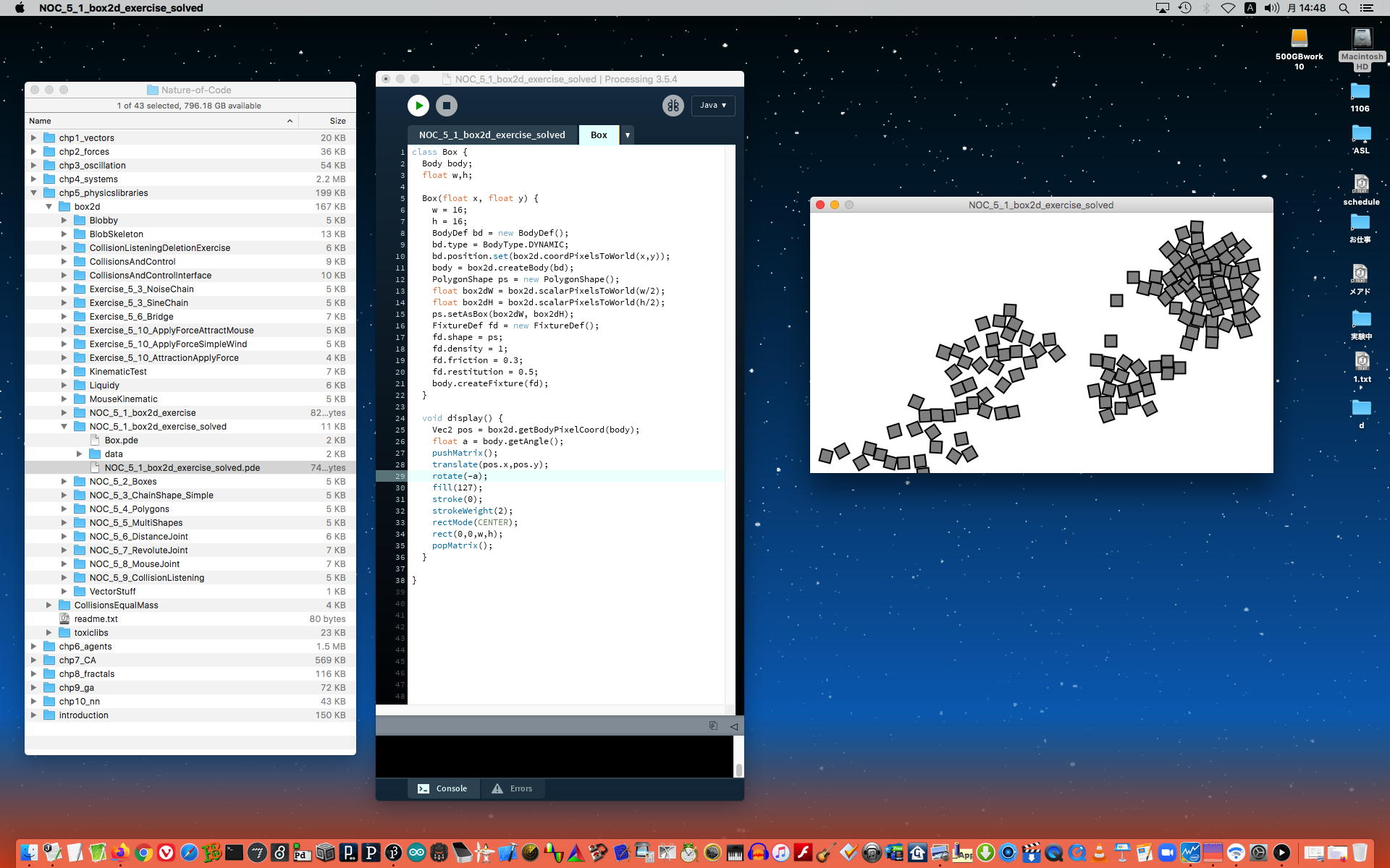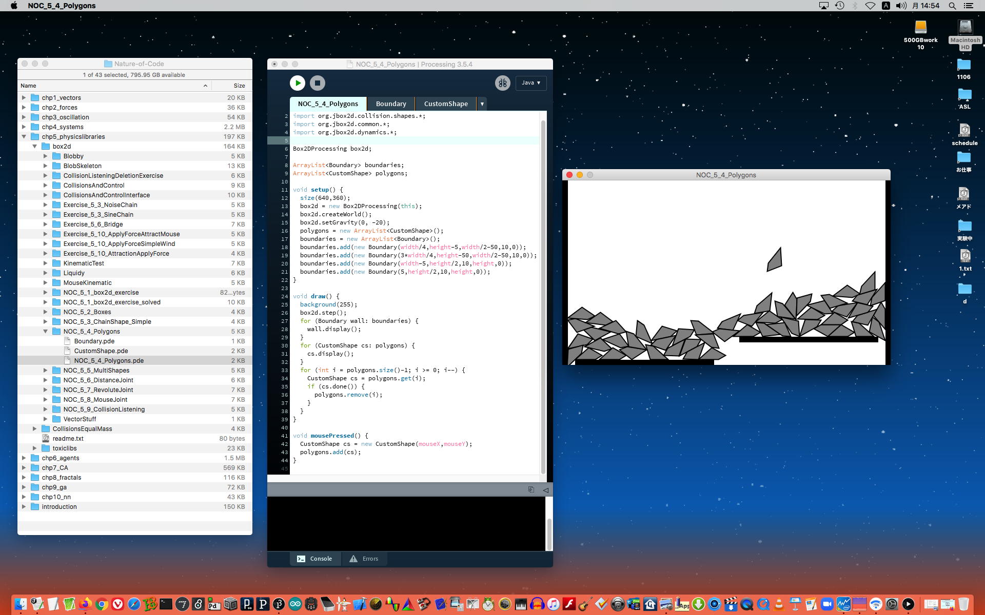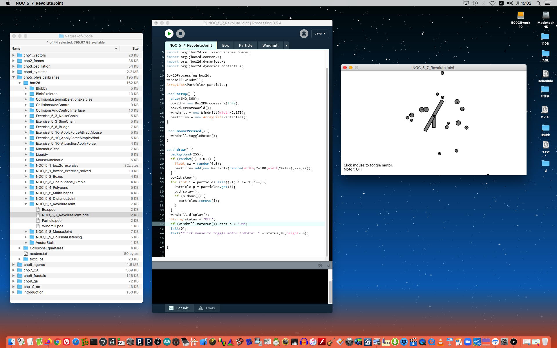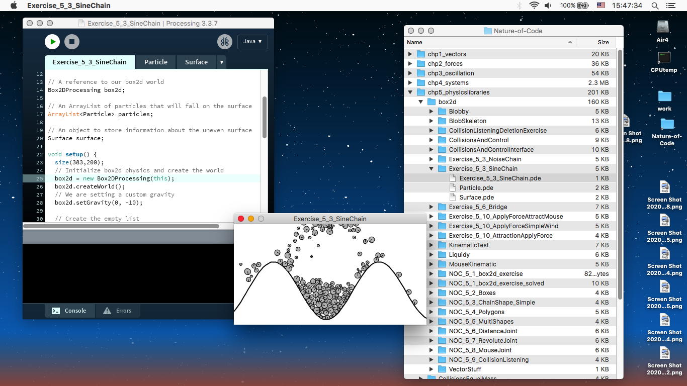 かなり「対症療法」的な対応であるが、とにかくテキストのサンプルが実際に走るというのは重要なのだ。 しかしその後、上記の「box2d_processing を pbox2d にリネーム」というのは実は不必要な間違いと判明して、「box2d_processing」を「libraries」の直下に置いて、上記の3点のProcessingソースの置換だけでエラー無く進められることを確認した。 その後はサンプルを次々に試してみたが、これはかつてゼミでやった「Unity勉強会」のデジャヴみたいなもので、要するに各種の物理モデルの綺麗な振る舞いに感嘆する・・・という感じの楽しい時間となった。