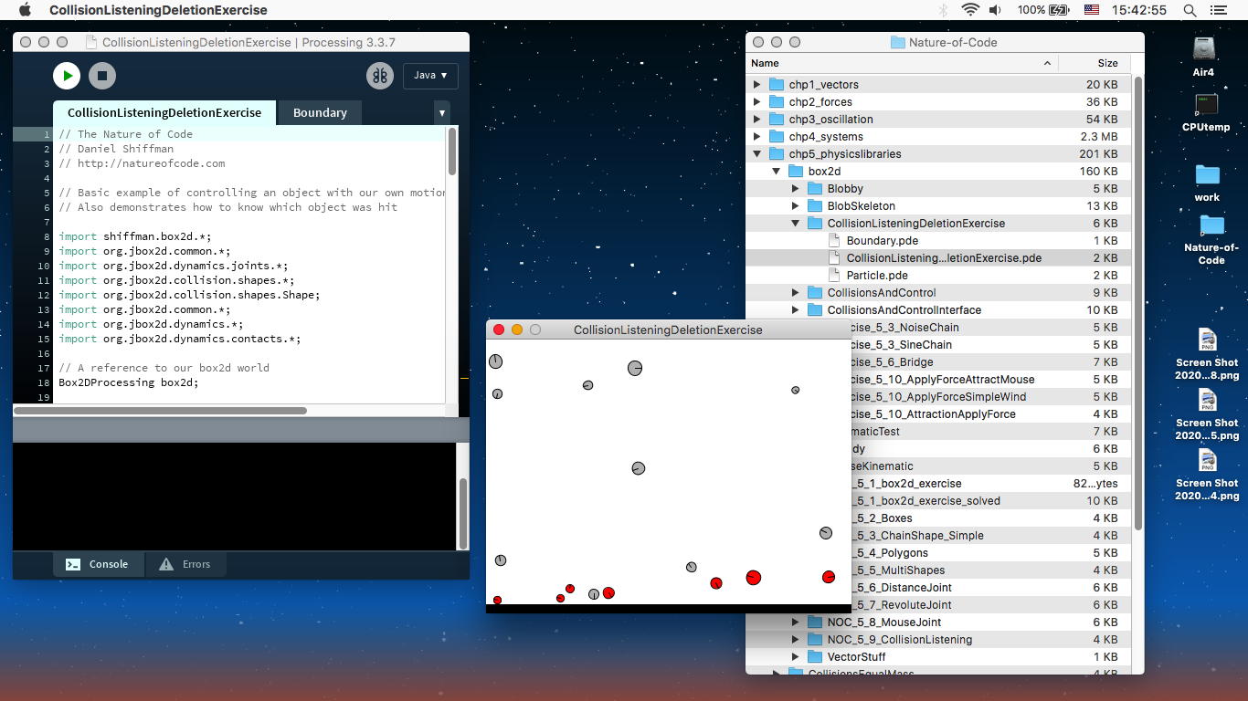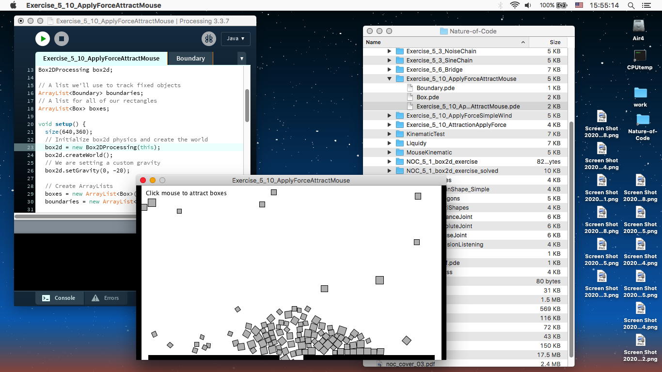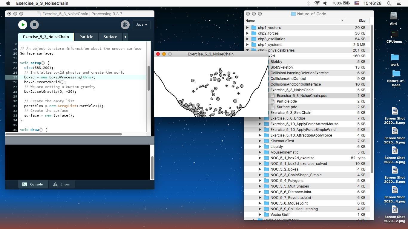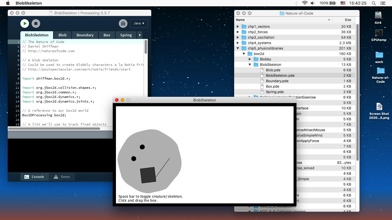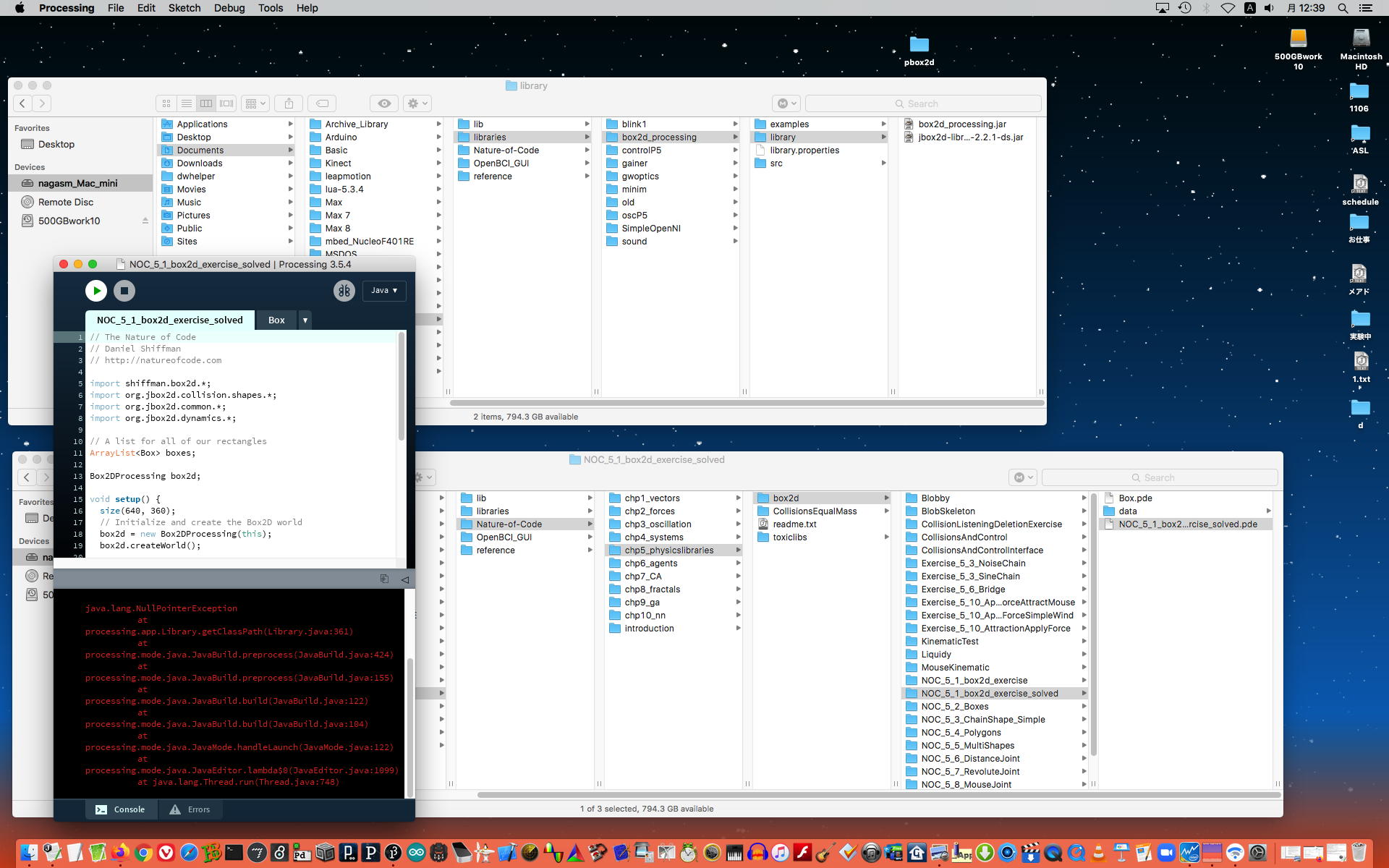 かなり「対症療法」的な対応であるが、とにかくテキストのサンプルが実際に走るというのは重要なのだ。 しかしその後、上記の「box2d_processing を pbox2d にリネーム」というのは実は不必要な間違いと判明して、「box2d_processing」を「libraries」の直下に置いて、上記の3点のProcessingソースの置換だけでエラー無く進められることを確認した。 その後はサンプルを次々に試してみたが、これはかつてゼミでやった「Unity勉強会」のデジャヴみたいなもので、要するに各種の物理モデルの綺麗な振る舞いに感嘆する・・・という感じの楽しい時間となった。