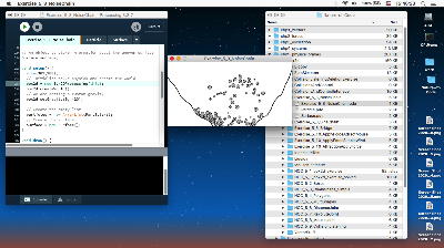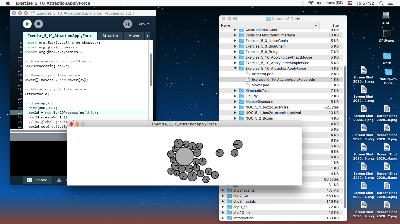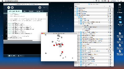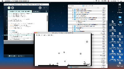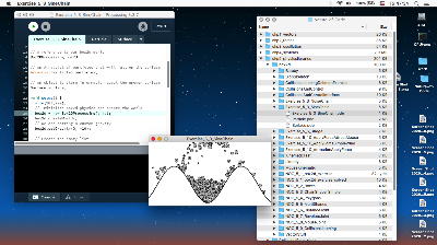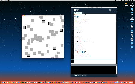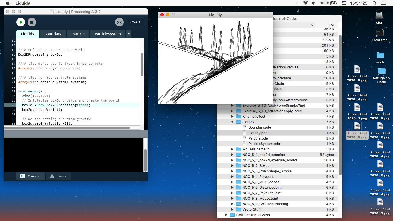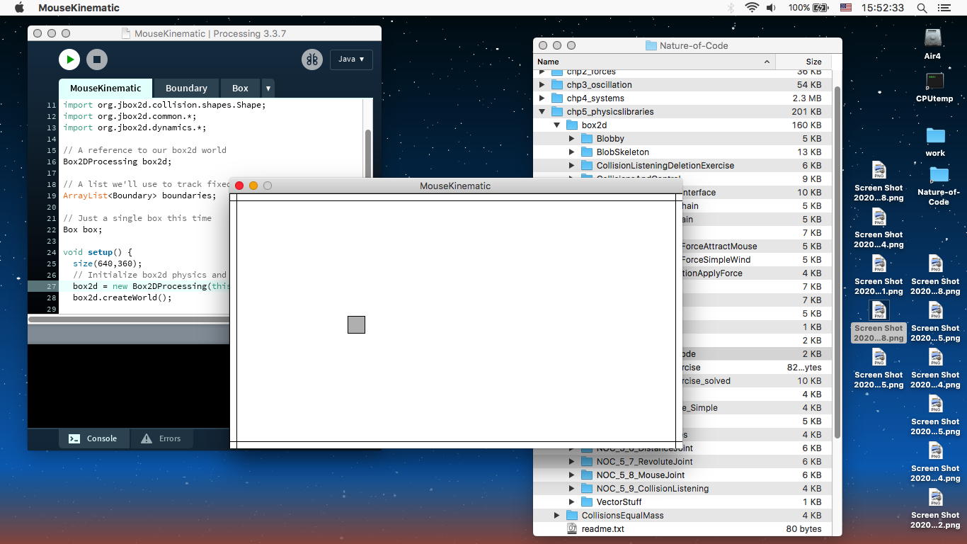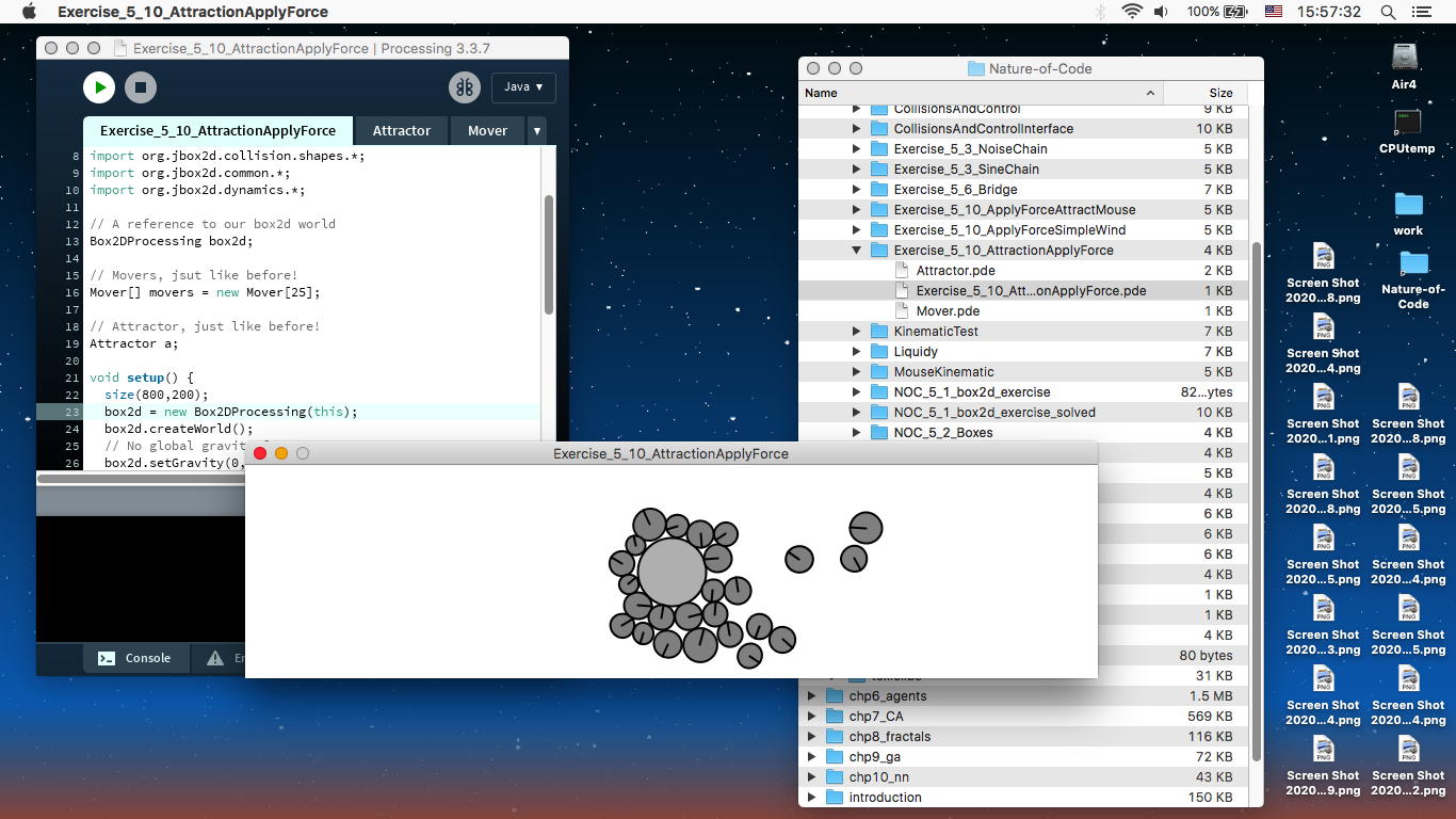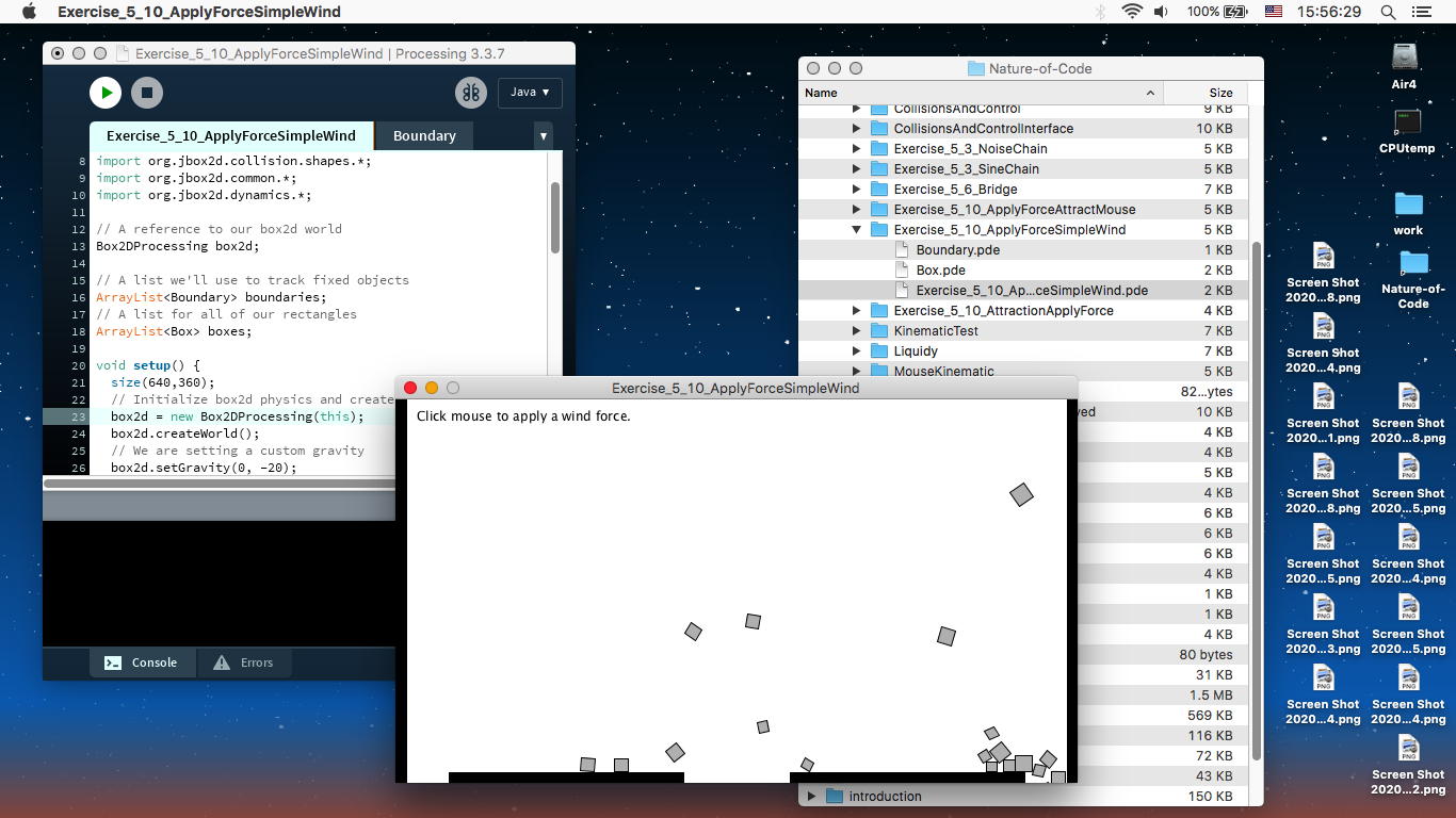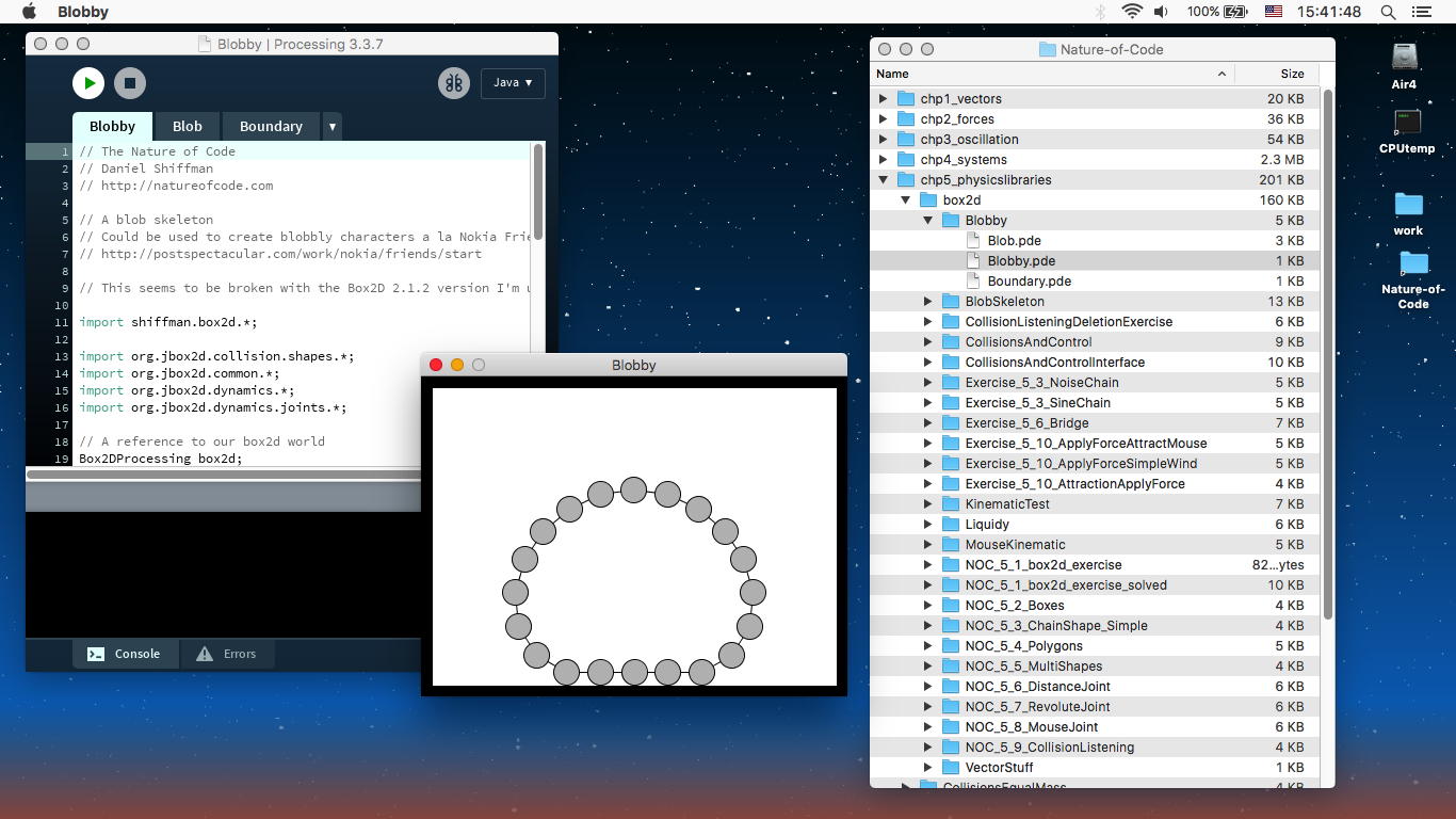 かなり「対症療法」的な対応であるが、とにかくテキストのサンプルが実際に走るというのは重要なのだ。 しかしその後、上記の「box2d_processing を pbox2d にリネーム」というのは実は不必要な間違いと判明して、「box2d_processing」を「libraries」の直下に置いて、上記の3点のProcessingソースの置換だけでエラー無く進められることを確認した。 その後はサンプルを次々に試してみたが、これはかつてゼミでやった「Unity勉強会」のデジャヴみたいなもので、要するに各種の物理モデルの綺麗な振る舞いに感嘆する・・・という感じの楽しい時間となった。