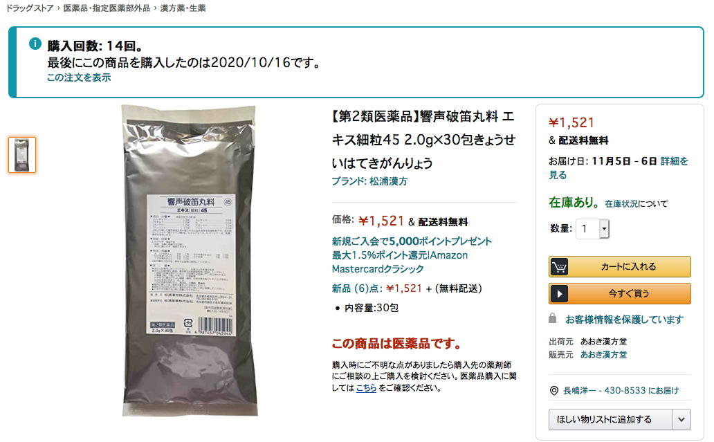 するとここはちょうど昭和ゾーンであり、ウォームアップも順調、そして男性の曲と女性の曲が程よく散らばっていて、なんと途中の「Drug Time」も無しで完走した。 「Drug Time」とは、いつも5時間とかヒトカラで歌い続けていて声が疲労してくると必ず途中(3時間経過あたり)で服用する、以下の漢方薬「響声破笛丸料」であり、ちっとも怪しくないものなのだ。 もう何年も前から愛用しているが、ネット情報によれば「声優、歌手などもこれを愛用している」ものだという。 何より、本当に効くのだ。 飲んで1分もすると、出なくなりかけていた声が出てくるのだから、漢方、恐るべしである。