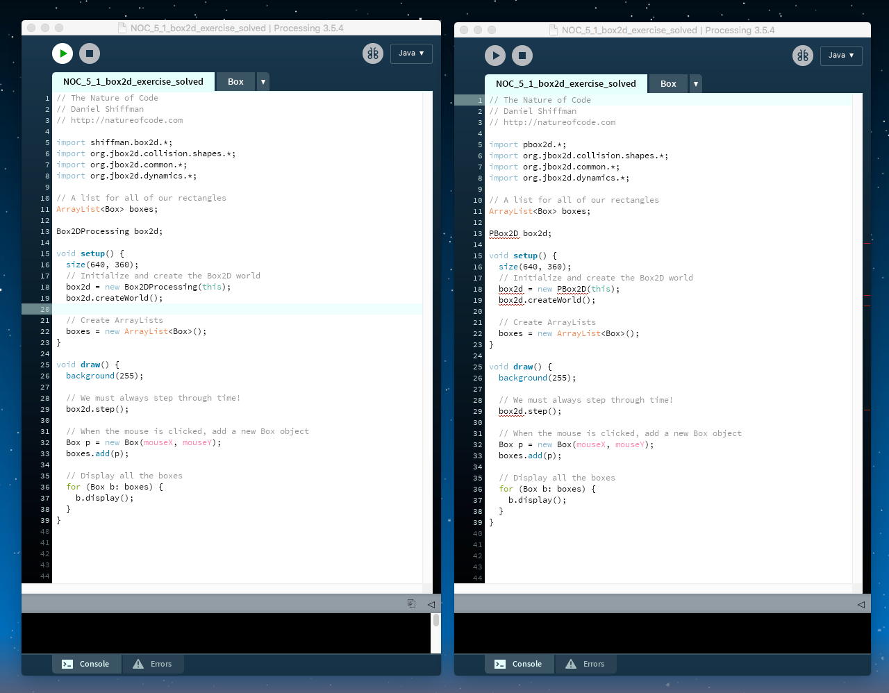 - 「import pbox2d.*;」 → 「import shiffman.box2d.*;」 とする