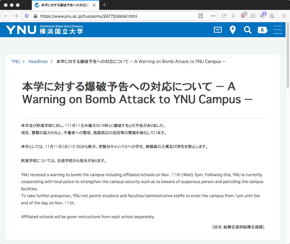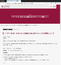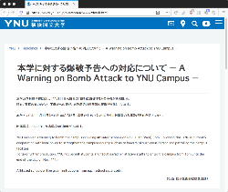 そして午前中に、2ヶ月に一度のアトピーの薬を処方してもらいに徒歩5分の遠州病院に行って、お昼に研究室に帰ってくると、なんと SUACに爆破予告 が来たというメイルが学長から全学に届き、明日は終日、全学入構禁止となって、ゼミもパスとなってしまった(^_^;)。 このところ全国的に頻発している公立大への爆破予告だが、ようやくSUACも全国区として認知されたとか、「上智大と横浜国大とSUACが並んだ」とは名誉だとか、いろいろと感慨もある。 しかし、爆破予告の11月11日(水)午後3時に対して、上智大と横浜国大は全学入構禁止が当日の午後1時からであるのに対して、SUACだけは前日(今日)の19時からあとは当日ずっと終日である。 ちょっとビビり過ぎではないのか???