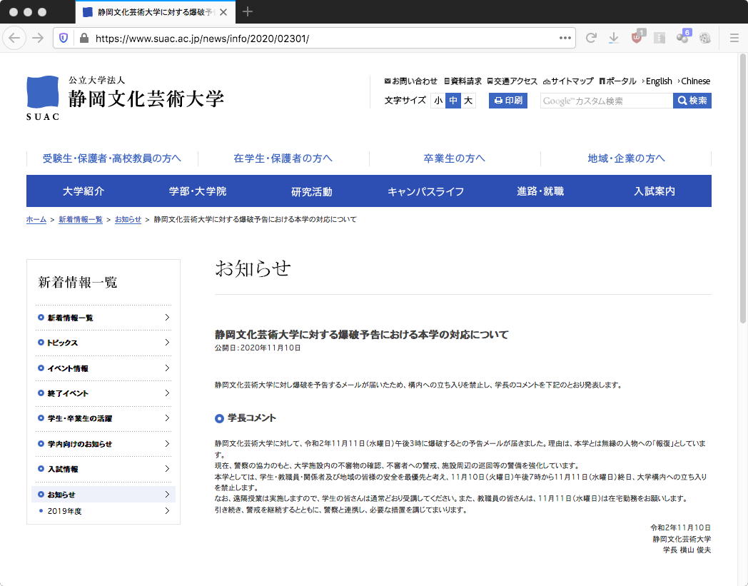 昨日の爆破予告はもちろん何も起きずに過ぎ去り、大学からは「 静岡文化芸術大学への爆破予告に対し、警察の協力のもと、大学施設内の不審物の確認、不審者への警戒、施設周辺の警備の強化を実施するとともに、11月11日(水)終日、大学構内への立入りを禁止しておりました。その結果、爆破予告時刻において爆発等の被害はなく、その後も、大学施設内に特段の異常がないことが確認されましたので、11月12日(木)午前零時をもって立入禁止措置を解除いたします。また、11月12日(木)の授業は通常どおり実施いたします。ご理解とご協力をいただきました皆様に感謝いたします。今回の事案について、引き続き警察と連携しながら、必要な措置を講じてまいります。 」というようなメイルが一斉連絡されて一件落着である。 次回はおそらく上智大や横浜国大のように、爆破予告が15時であれば午前の講義は通常通りになるような気がする。