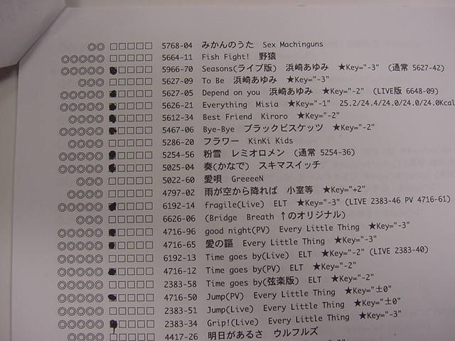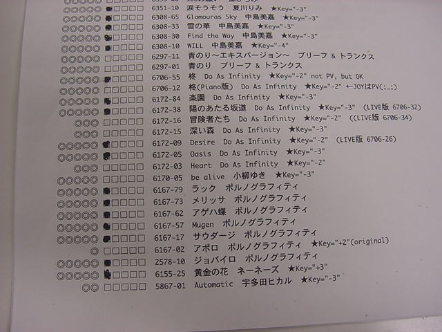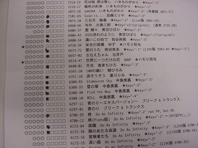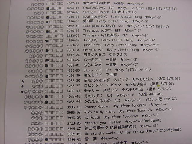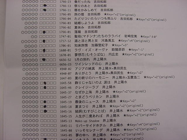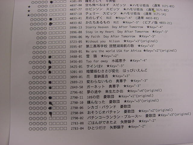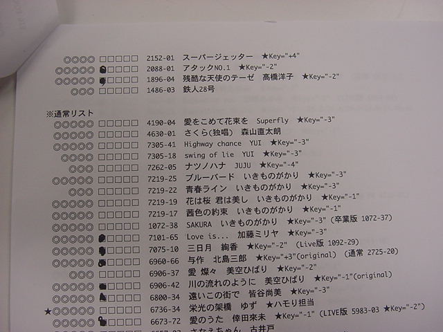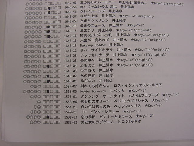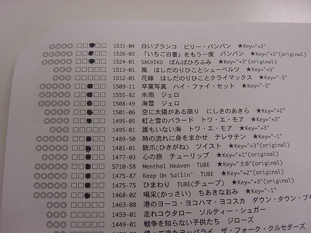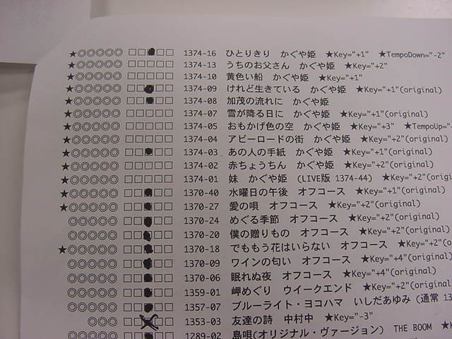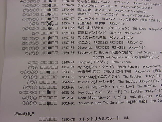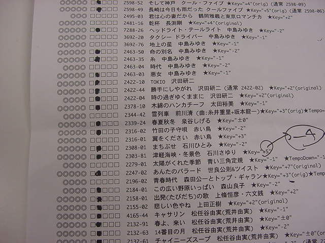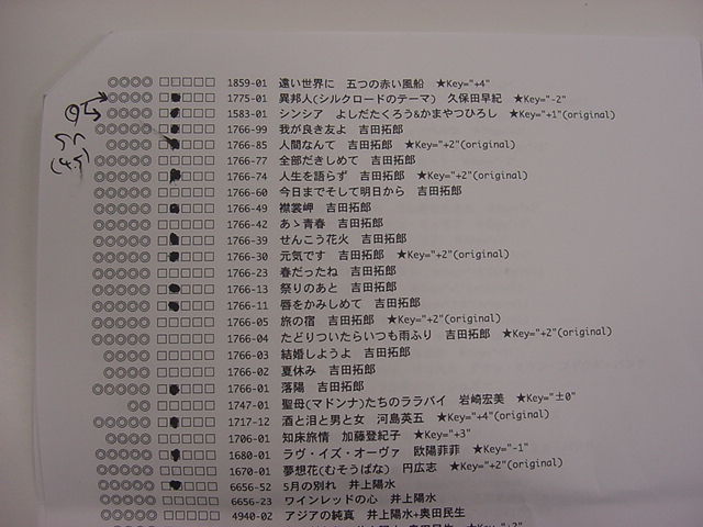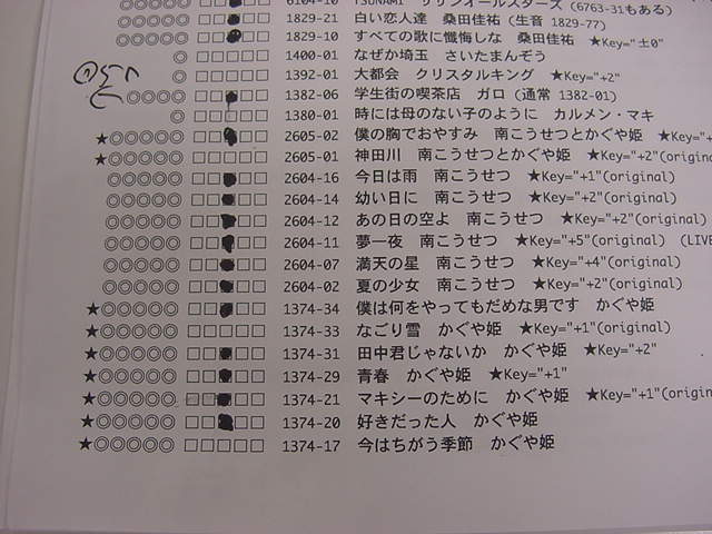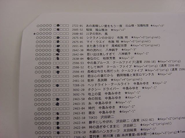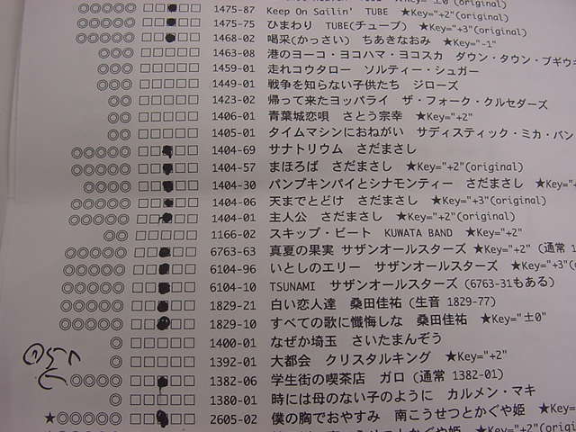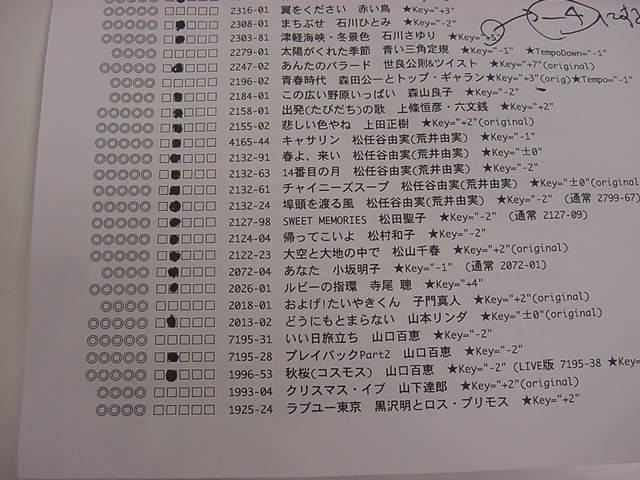 昨日のJoyJoyは5時間で63曲(やはり昭和の曲は短い!)だったが、中身としては先週の初めての挑戦の続きをしてみた。 先週は、プリントして持参している このリスト の2ページ目と3ページ目の曲だけを歌うという「縛り」で55曲を歌ったが、そうなるとリストの他のページは真っ白である。 そこで昨日はちょっと無謀だと自覚しながらも、その続きの4ページ目と5ページ目の曲だけを歌うという「縛り」でスタートしてみた。