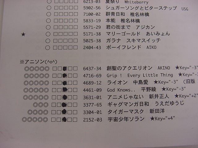 そして昨日のJoyJoyは5時間半で67曲(やはり昭和の曲は短い!)を完走して、もちろん途中では「Drug Time」もあった。 先々週と先週は、プリントして持参している このリスト の2/3ページ目と4/5ページ目の曲だけを歌うという「縛り」だったので、当然ながらその続きとして6ページ目と7ページ目の曲だけを歌い、7ページ目の下段は無いので1ページ目の下段にあるアニソンを全て網羅してみた。 これで一応、 このリスト の全ページにチェックがたくさん入ったが、それぞれのページにはまだ「抜け」があり、普段であれば歌っている好きな曲もたくさん残っている。 おそらく次回(土曜という気がする)は、この「落穂拾い」(チェック済の曲は重複せずに新たな曲だけ、という縛り)に挑戦することになりそうだ。 COVID-19(コロナ禍)によって出張も旅も行けず、学生とのアカペラも出来ず、というストレスに対抗して心身のホメオスタシスを維持するために、ヒトカラを続けるのは僕にとって唯一の生命線なのである。