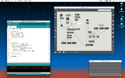 その後、かつてチーム「硬派」のシステムで使っていた「Arduino〜RGBリボンLED」のボードがちょっと異常動作をしていたのを思い出して、Firmataでなく、直接Max8からシリアルで出してArduinoで受けてPWMする・・・という、いわば「Arduino2Max」の逆の「Max2Arduino」というのを作ってみた。 異常動作の原因は、一緒に貸し出していた「12V2A」のスイッチングACアダプタが寿命を迎えたのか、新しいものに交換したらトラブルは消えて、さらに「Max2Arduino」での輝度制御も、上のようにMax8からのシリアルをArduinoからエコーバックしつつサクサク動くことを確認できた。 これは今後に使えるし、さっそく メディア数理造形演習 の3チームのうちの1つでも活用できそうである。(^_^)