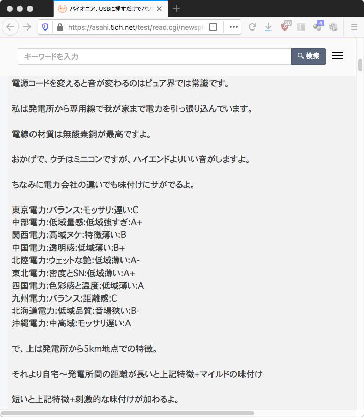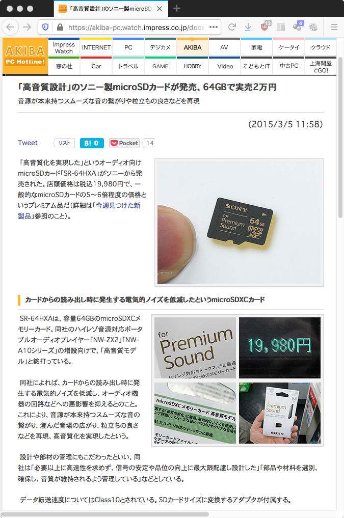そして、天下のパイオニアがこれなら、天下のソニーはこれだ、というのが「"高音質設計"のソニー製microSDカードが発売、64GBで実売2万円」という、これまた非常識なプラシーボ製品の記事のリンクもあり、最後には定番の「電力会社の違いによる音質の違い」といういつものコピペがあった。 ピュアオーディオを極めるのであれば、ここまで「信心」しないといけないのである。 かつてパイオニアからの受託研究をした時に、川越事業所に何度も行ったが、遂にこんな製品を出すところまで来てしまったのか・・・となかなか感慨深い。 かつて技術士として企業のコンサルティングに関わってきて以来、三◯造船、積◯樹脂、島◯製作所、ヤ◯ハ、豊◯中研、そしてパ◯オニアと、大企業だからこそ「大企業病」が避けられないという実感にまた新しい1ページが加わった。