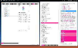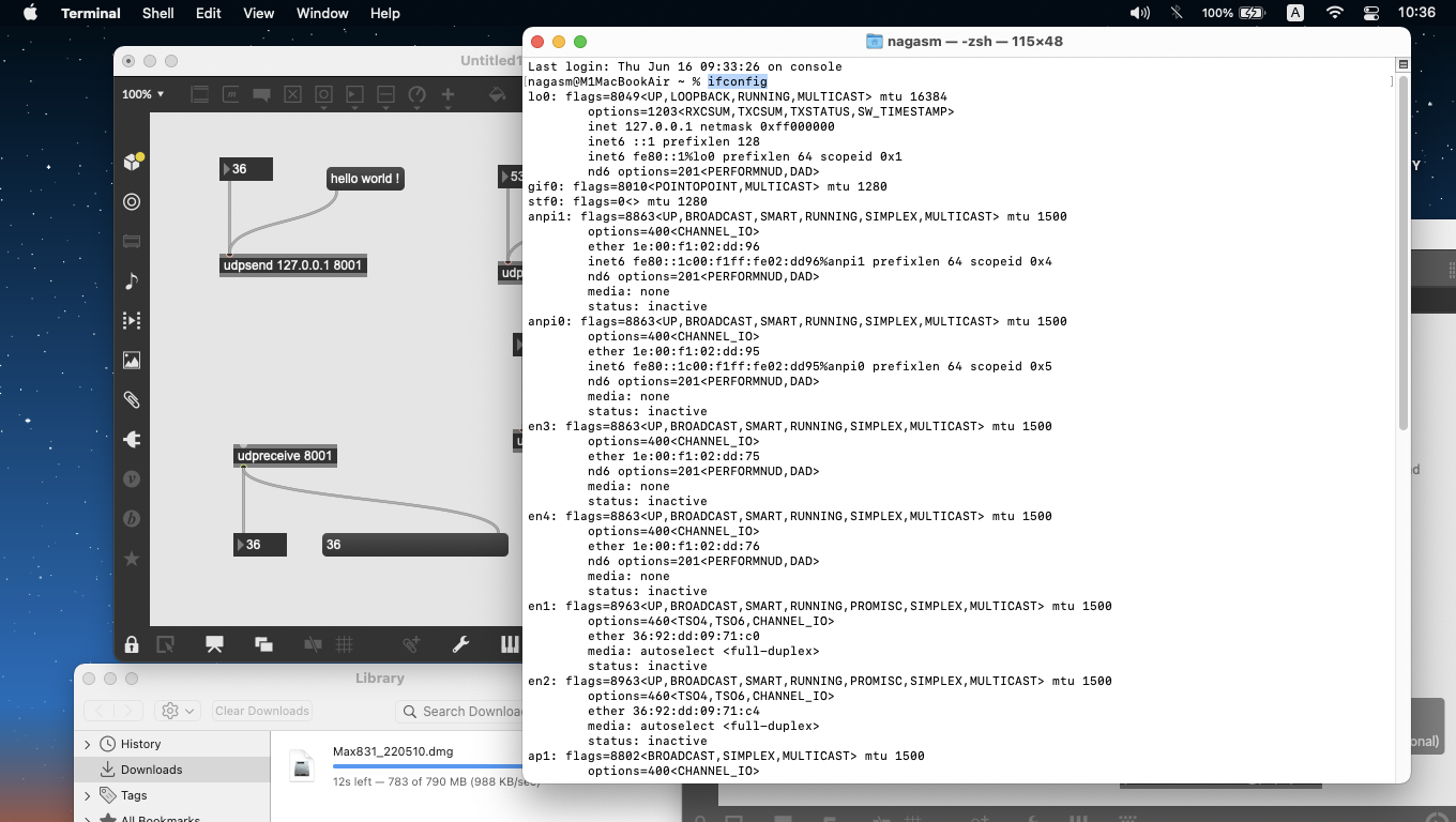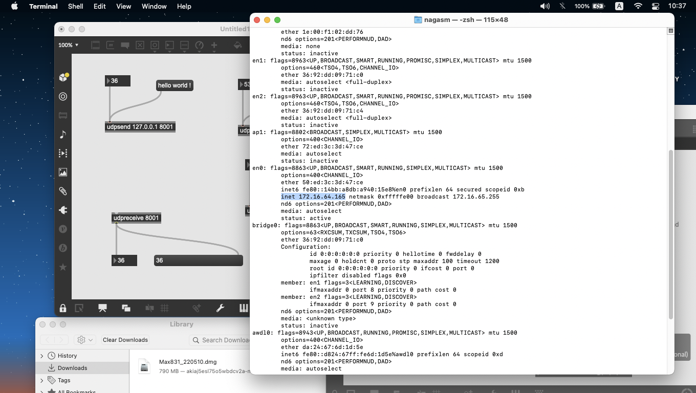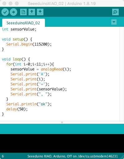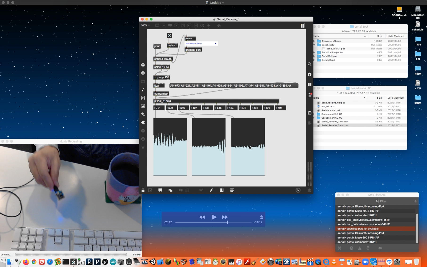 Arduinoスケッチは超シンプルな、最大11チャンネルアナログ入力情報をUSBシリアルから出力するというものであり、実際にはA0・A1・A2に3軸加速度センサが取り付けられていて、他のアナログ入力端子は浮いた状態になっている。 動画 では、まずターミナルのscreenコマンドによってシリアル出力情報がモニタ出来て、次にMax8のパッチによって3軸の加速度データがグラフとしてリアルタイム可視化できている。 ちなみにターミナルで実験した直後にMax8に切り替えると、システム(OS)がまだArduinoを掴んだまま[SeeeduinoXIAOのブルーLEDが点灯を続けているのでシリアルポートは接続のまま]で動画のようにエラーが出た。 こういう場合にはMax8はquitすることなく単にパッチを閉じるだけでOK、USBコネクタでArduinoを抜いて挿してリセットすると、今度はちゃんとシリアルポートを認識してくれた。 今回のProcessingスケッチでは、このMax8パッチの「route」オブジェクトのように、コンマ(無視)とスペース(パラメータ区切り)によって「長い文字列」(最後はLF[改行])として入力するシリアルを解釈(parsing)する・・・というのを作ったことが無かったので、それに初トライするというのが目標なのだ。