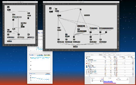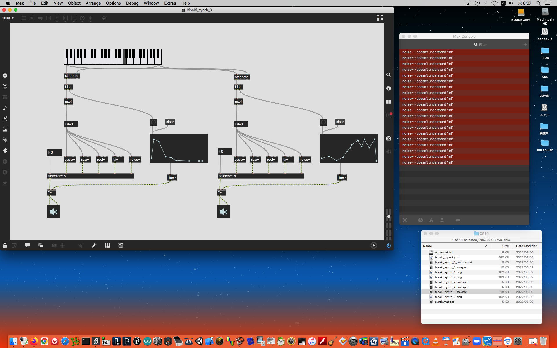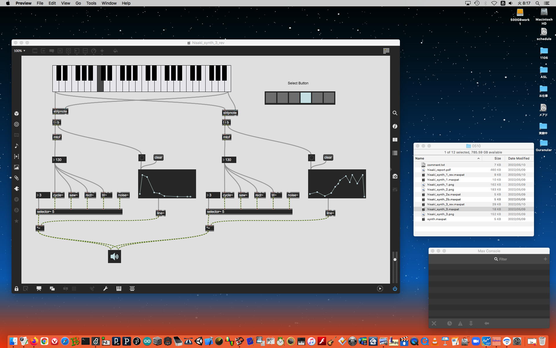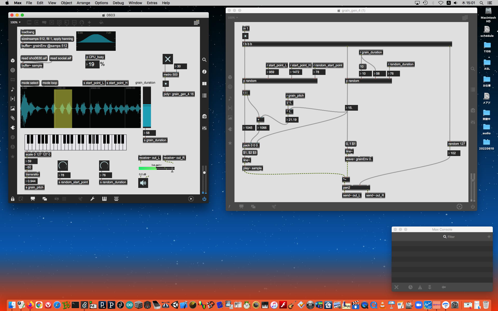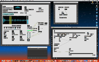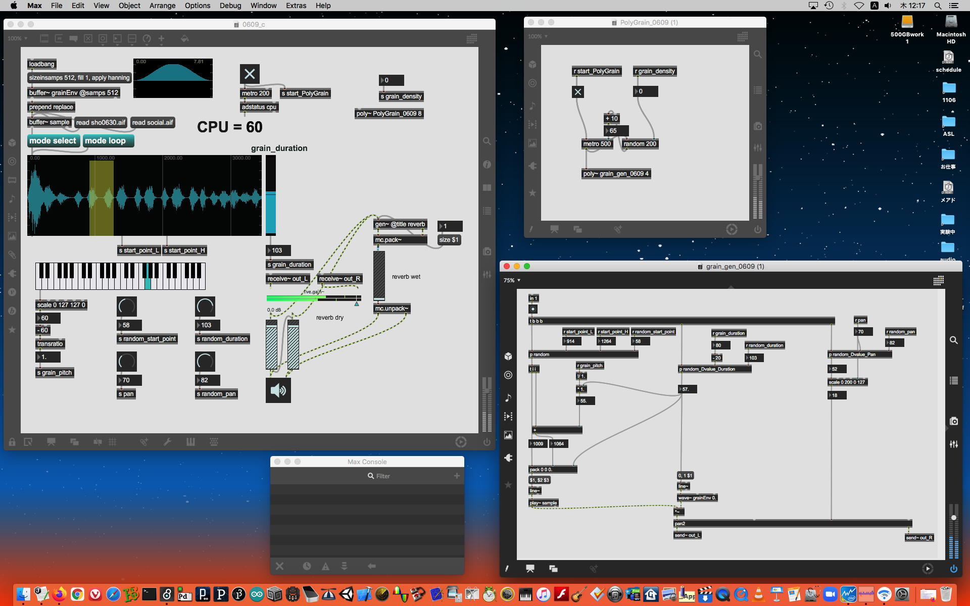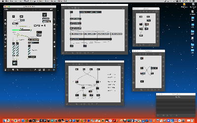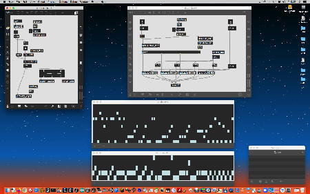 ゼミの日である。 いつものように早起きして研究室に出てきて、昨日の試験的Max8パッチにCycling'74のExamplesから発掘したモジュールを追加して、 このように、 ゼミでは日崎くんや王さんの今後の発表のために簡単なDemo Performanceの形で紹介した。 そのYouTube記録は これ と これ である。 王さんは「毎週1曲」という作曲に挑戦を続けている。 清水さんも、なんとか環境は回復して、ちょっと一安心という経過を報告してくれた。 そして、日崎くんも進捗をデモ報告して、さらに吉田さんと進めている例の問題に皆んなで悩んで、ぼちぼち進んだ。