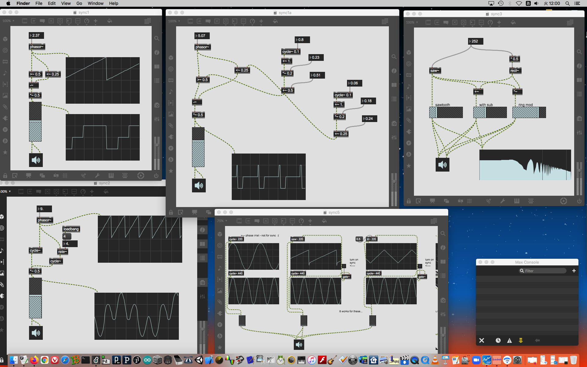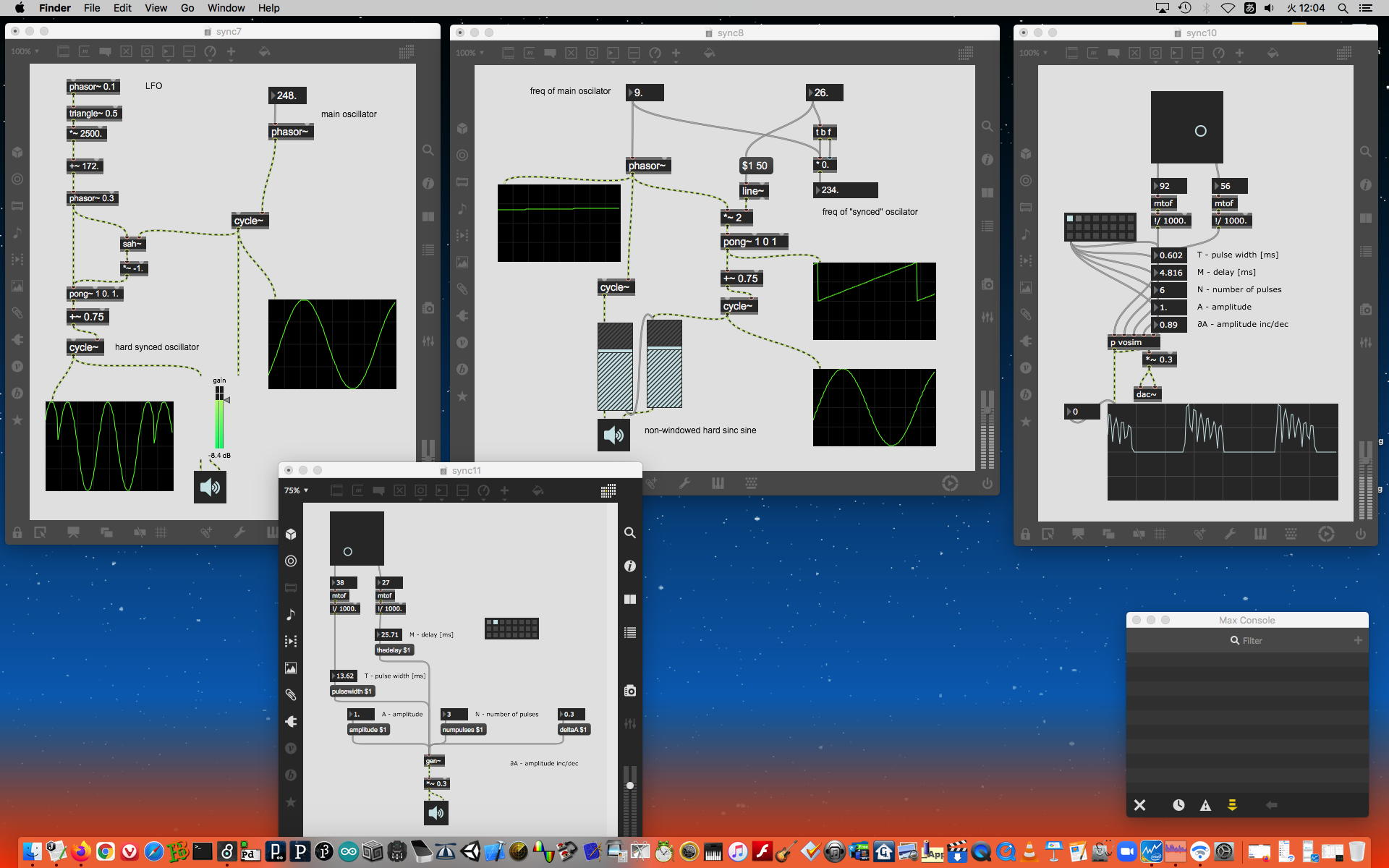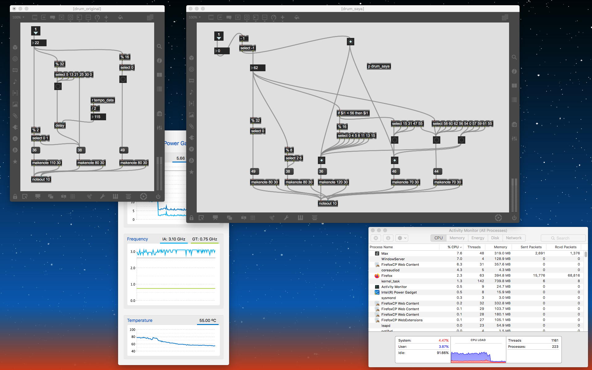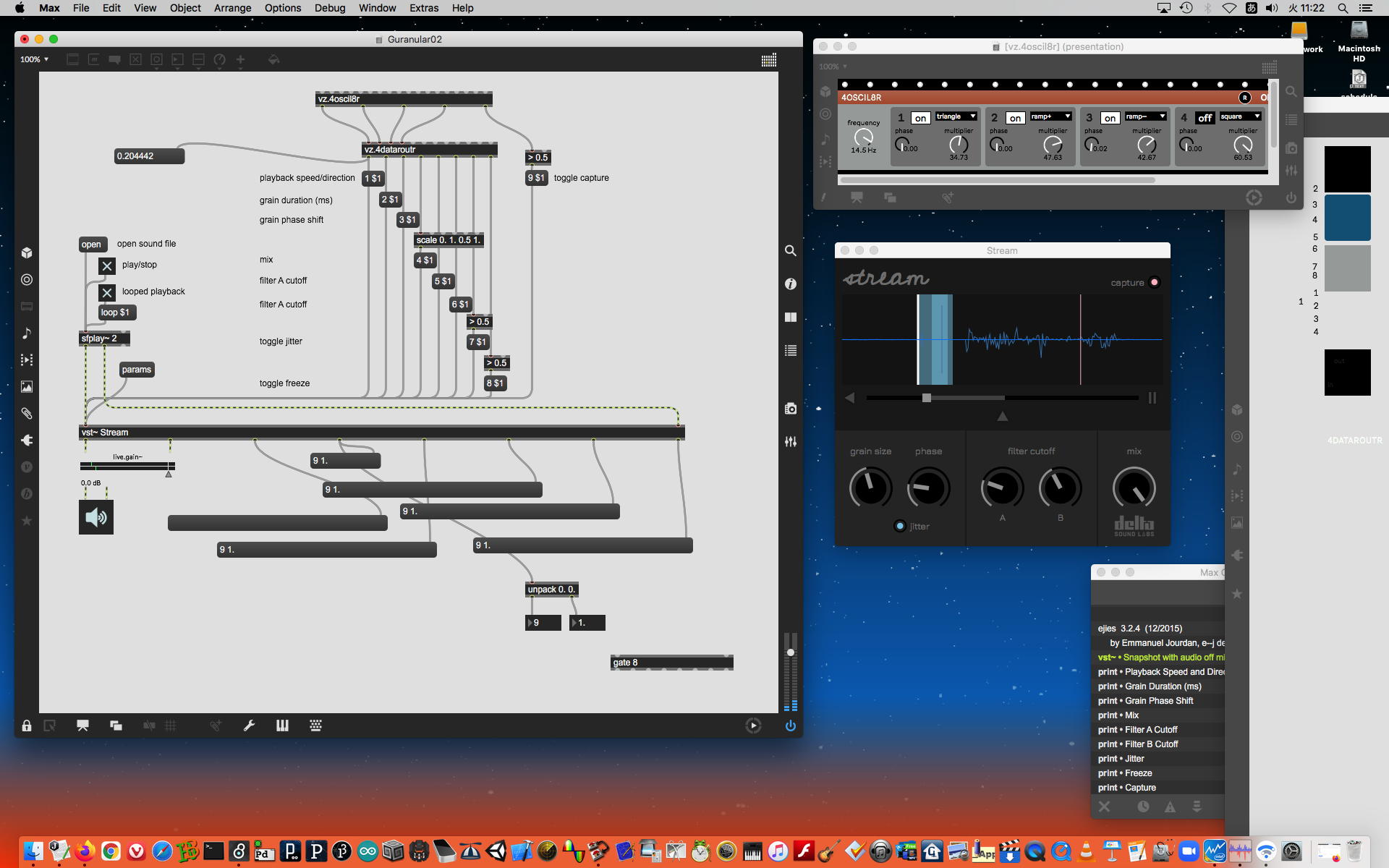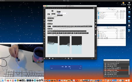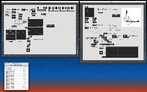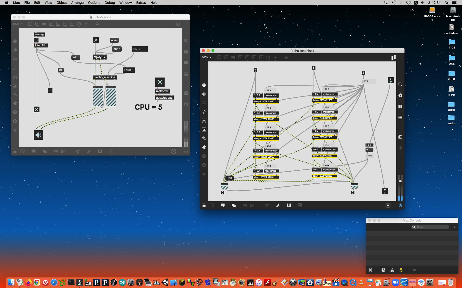 ゼミの日である。 いつものように早起きして研究室に出てきて、昨日の試験的Max8パッチにCycling'74のExamplesから発掘したモジュールを追加して、 このように、 ゼミでは日崎くんや王さんの今後の発表のために簡単なDemo Performanceの形で紹介した。 そのYouTube記録は これ と これ である。 王さんは「毎週1曲」という作曲に挑戦を続けている。 清水さんも、なんとか環境は回復して、ちょっと一安心という経過を報告してくれた。 そして、日崎くんも進捗をデモ報告して、さらに吉田さんと進めている例の問題に皆んなで悩んで、ぼちぼち進んだ。