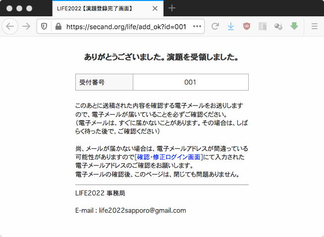 そして、「演題登録」というのはどんな感じなのかな・・・とそのページに入っていき、一応のダミーのタイトルとダミーの概要を入力してみると(期限までいくらでも改訂できるので)、なんと事務局から上のように「受付番号 001」をゲットしてしまった(^_^;)。 まぁ、論文提出で「受付番号 001」をゲットしたことは過去の国際会議とかでもあったので驚かないが、早くも「夏の札幌」が遠くに浮かんできた感じがして、COVID-19でずっと低空飛行をしていたテンションがやや上がってきた感じがした。
