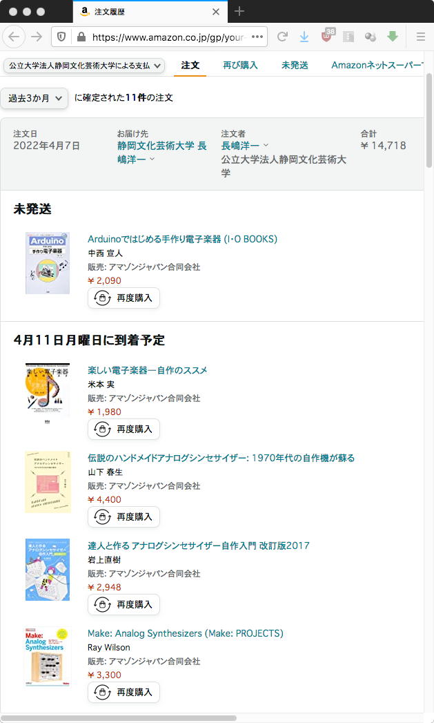そして、建築領域から領域変更して3回生からインタラクション領域に来たある学生が、「アナログシンセサイザーを作りたい」などと言ってきたので、上のような本をAmazonに発注した。 この学生は上の5冊のいちばん下の本を図書館から借りて持ってきたのだが、今どきの学生にとって、これを理解して実際に作る・・・というのはなかなか難易度が高く、それも4年間の半分を過ぎてからというのはあまりに遅きに失しているのだが、まずは2回生と一緒に「サウンドデザイン」をとり、同時に3回生と一緒に「音楽情報科学」もとり、さらに領域専門演習で僕のところに修行に来るのであれば支援する・・・という話になった。 果たしてどうなるか、とりあえずはKORGのLittleBitSynthあたりからスタートしそうで、これはゼミの連中にもウケそうだ。