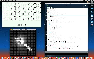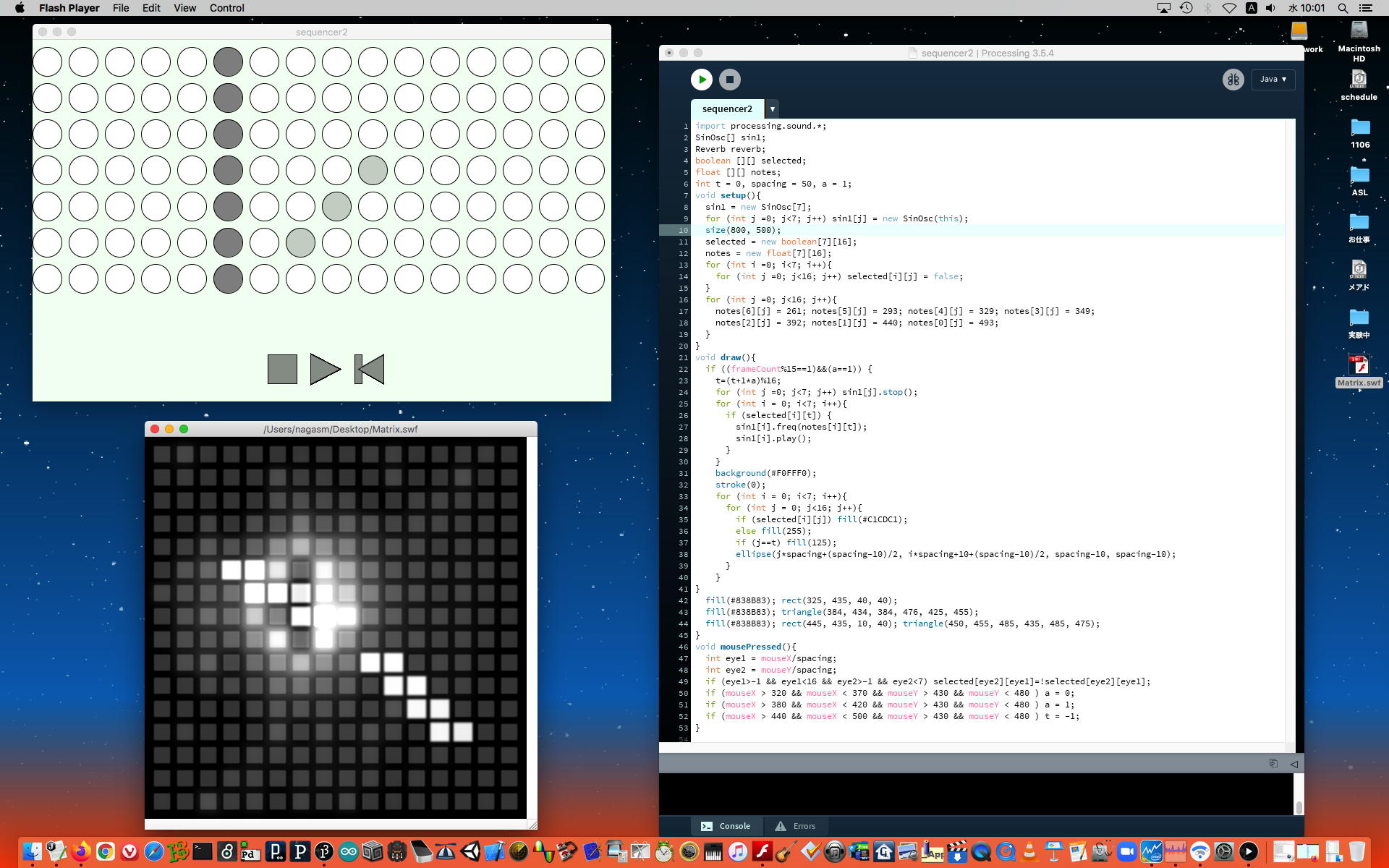 水曜日、ゼミの日である。 講義期間中は、水曜日は突出して朝イチのテンションが上がるのだが、「ゼミの日」というのはそれだけの価値があるのだ。 研究室に出てくると、北京の王さんからは、新学期の課題としていたProcessingに関して、ループ再生シーケンサのスケッチ試作が届いていた。 ダイアトニックスケールのものだったが、やはりここはペンタトニックである。 さっそく1106のページから、 このFLASH を発掘した。 これは90KBと小さいながら、16*16のマトリクスでペンタトニックのループシーケンサ(SPキーで全消去あり)の美しいコンテンツなのだ。 そこで以下のように、王さんのProcessingスケッチを一部修正(上が高いピッチ、停止中に初期化ボタンを無効化するバグ対策)したものを作った。