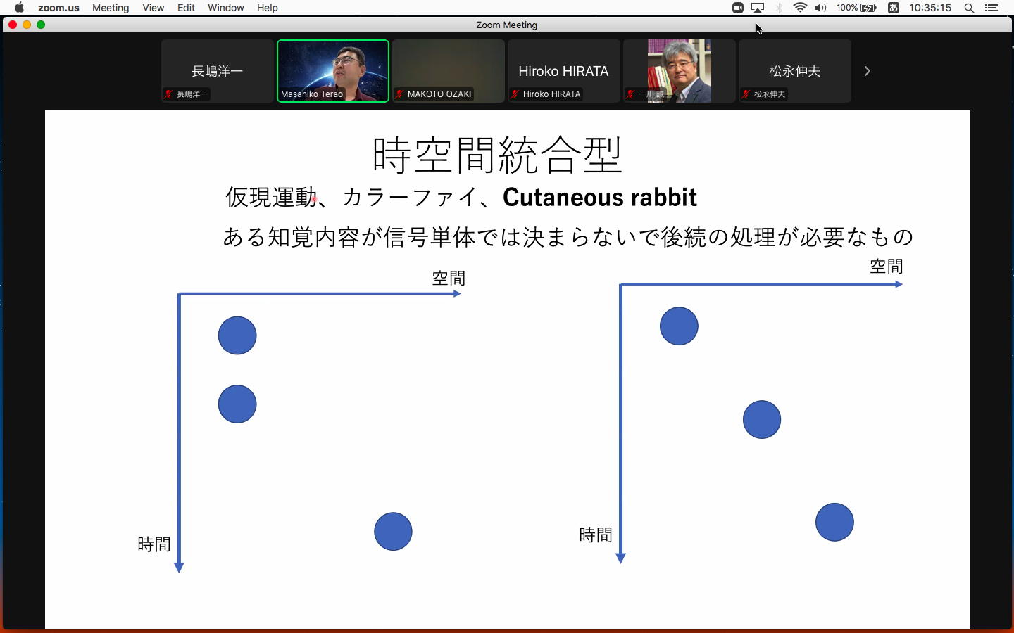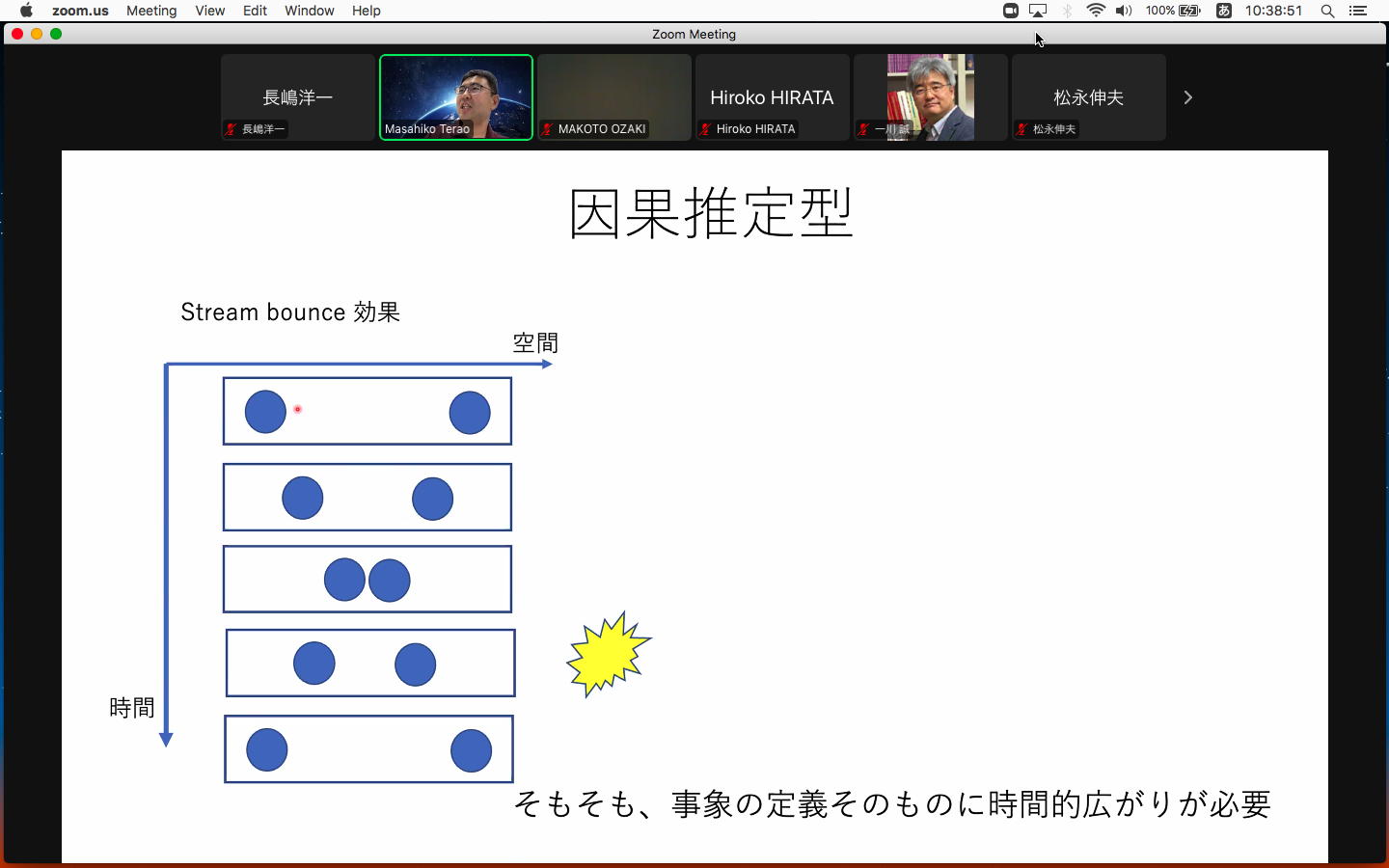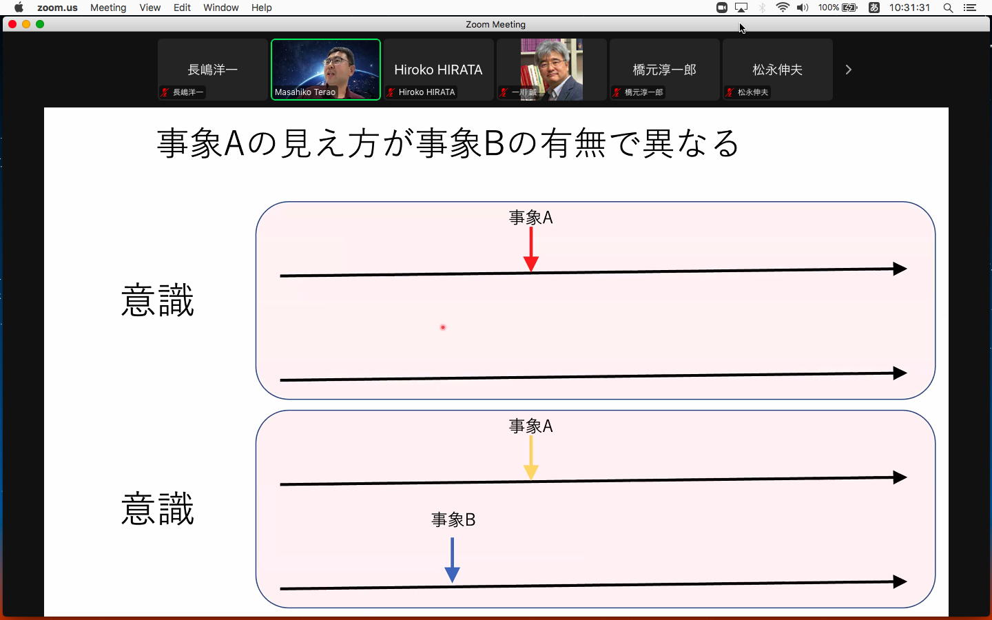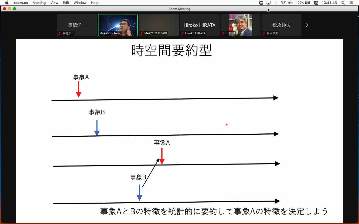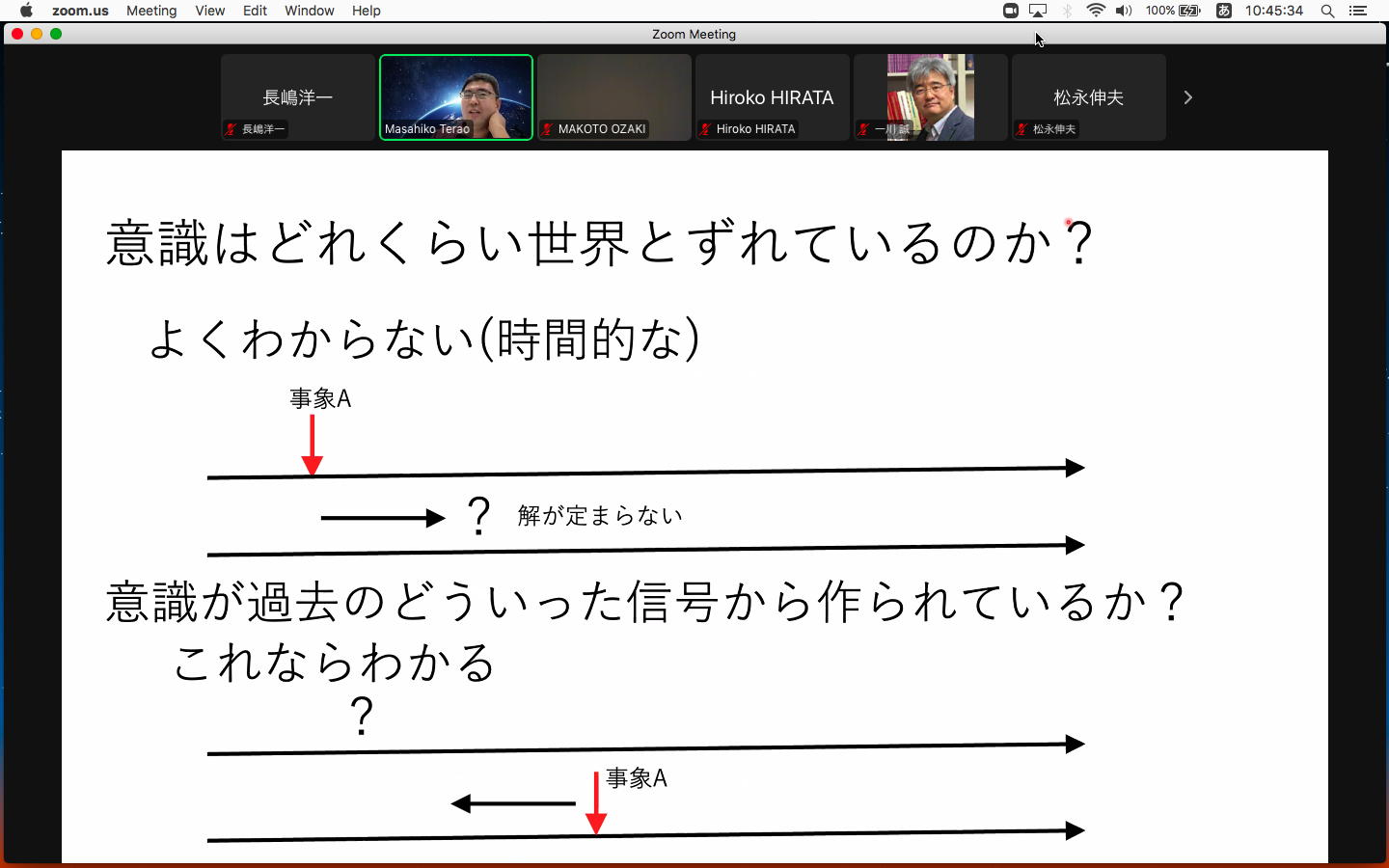 また、グラフィック系の日比谷先生とかわ先生への依頼として、学会発表論文に入れるイラストとして、絵心のある学生に手伝って欲しい・・・というメイルを出した。 We-mode認知の紹介のところで使いたい「両引き鋸」のイメージスケッチであるが、果たして協力してくれる学生が現れるかどうか、期待して待つことにした。 そして2限のゼミZOOMミーティングは、1106にやってきた東本クンを含む、以下のような4人で開催された。 ちなみに(リンク切れするが)全73分の記録動画は これ である。 皆んなそれぞれの近況と元気な顔を交換し、それぞれのテーマなどを提供し議論して、いよいよ新学期のゼミがスタートした。